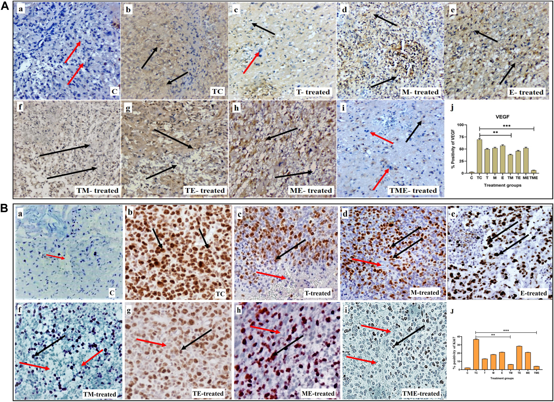 Considering the significant anti-invasive effect of the triple-drug combination, we then evaluated the expression levels of VEGF (angiogenic marker) and Ki67 (proliferation marker) in the tumor sections of the experimental groups. Assessment of cytoplasmic positivity for VEGF was significantly reduced in tumors treated with the triple-drug combination (6.36%) (specified by red arrows in Figure 2when compared with tumor-control (TC) group, which exhibited the highest (70.61%) level of cytoplasmic positivity (black arrows indicated in Figure 2A-i). Hitherto, TM, “T”- alone and TE depicted a moderate cytoplasmic positivity, as evident by the H-score of, 38.59, 50.38% and 46.45% respectively (Figure 2A-j).