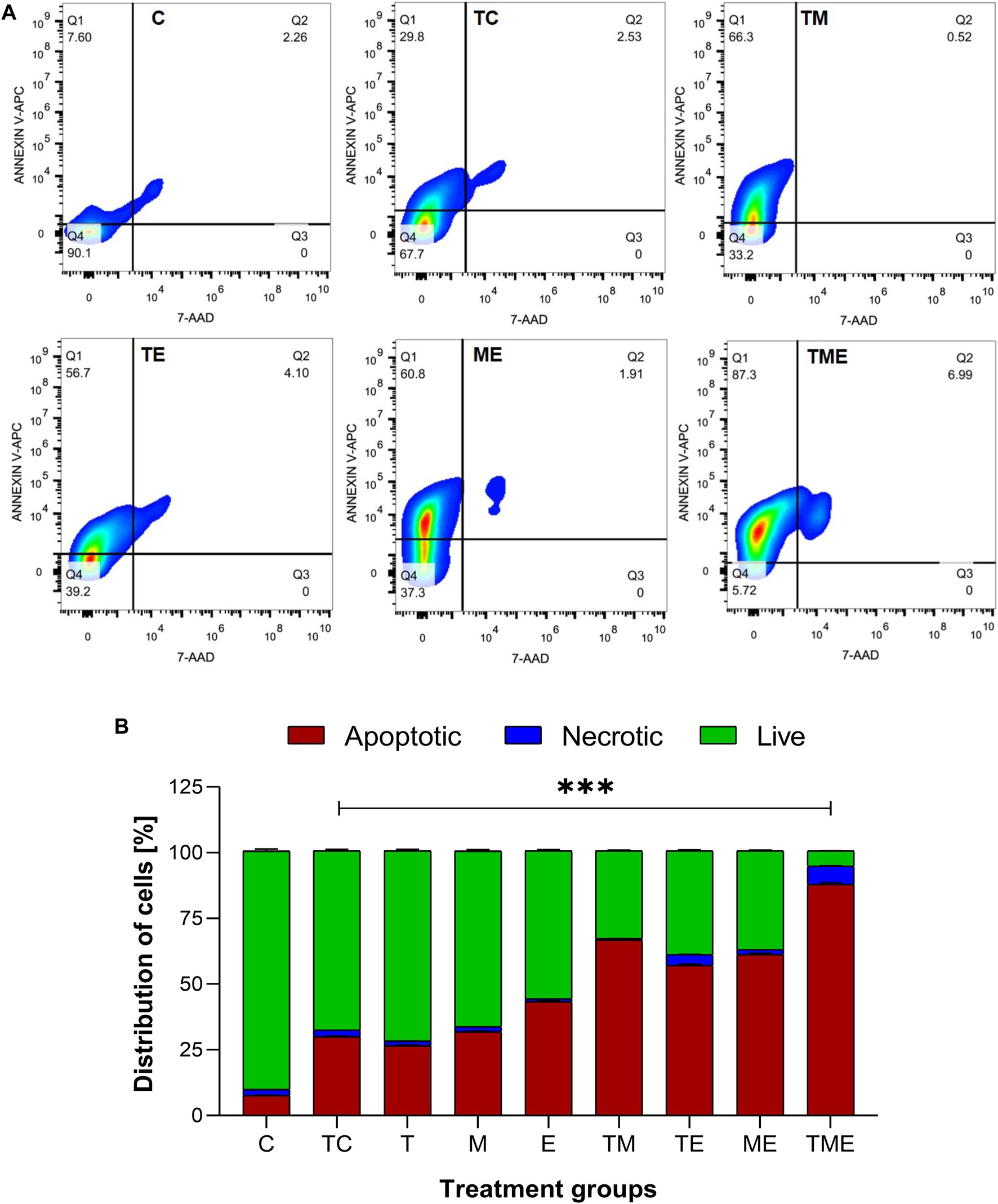 Apototis detection using ANNEXIN V- Flow cytometric analysis (A) The clustered bars represent total percentages of live, apoptotic and necrotic cells for the various treatment groups. (B) Represent the cell population in the 4 different quadrants (Q1- early apoptotic, Q2- necrotic, Q3- late apoptotic and Q4- live cells). All the experiments were performed in triplicates, the data is represented as mean ± standard deviation and the significance was calculated using two-way ANOVA (*** P<0.0001).