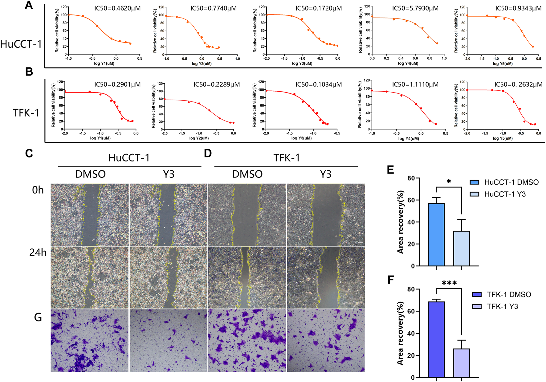 FIGURE 2. Lan C inhibited the proliferation of CCA. (A, B) The IC50 values of five drugs (Y1-Y5) in HuCCT-1 and TFK-1 cell lines. (C, E) Representative images of wound healing after 24 h of Y3 treatment in HuCCT-1 cell, the therapeutic concentration of Y3 was 0.1720 µM. (D, F) Representative images of wound healing after 24 h of Y3 treatment in TFK-1 cell, the therapeutic concentration of Y3 was 0.1034uM. (G) Representative images of transwell assay after 24 h of Y3 treatment in HuCCT-1 and TFK-1 cell. *Represents p-value less than 0.05, ***Represents p-value less than 0.001. Scale bars, 100 μm.