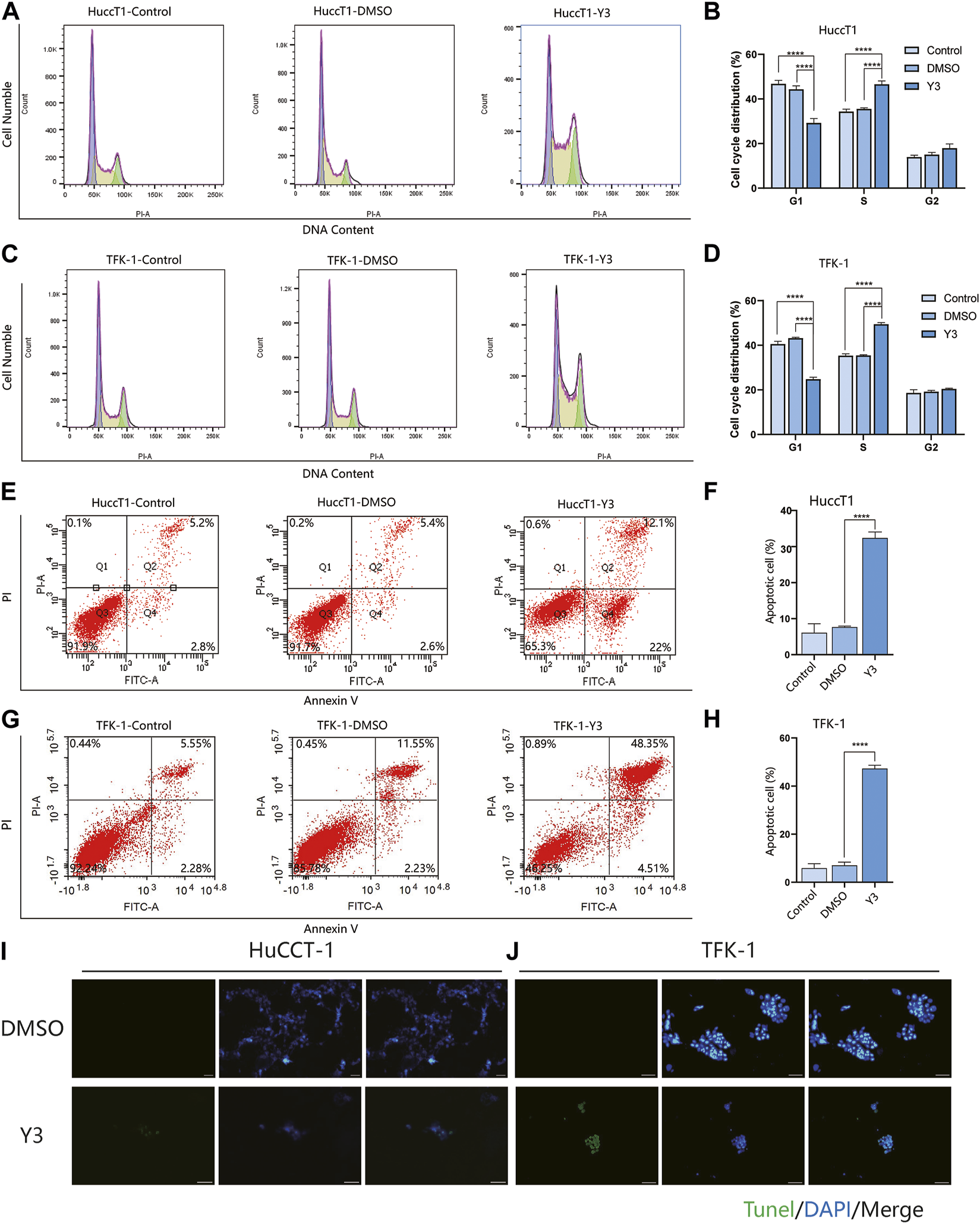 Y3 suppresses cell growth and induces apoptosis in CCA cells. (A, B) HuCCT-1 cells were treated with Y3 for 48h, and cell cycle distribution was determined by flow cytometry. (C, D) TFK-1 cells were treated with Y3 for 48h, and cell cycle distribution was determined by flow cytometry. (E, F) The HuCCT-1 cell line was treated with Y3 for 48h, percentage of cell apoptosis was determined by Annexin-V/PI staining and flow cytometry. (G, H) The TFK-1 cell line was treated with Y3 for 48h, percentage of cell apoptosis was determined by Annexin-V/PI staining and flow cytometry. (I, J) HuCCT-1 and TFK-1 cells were treated with Y3 for 48h, and the changes in apoptosis were detected by TUNEL assay. In the figure, the therapeutic concentration of Y3 for HuCCT-1 cell line was 0.1720uM, and that for TFK-1 cell line was 0.1034uM. ****Represents p-value less than 0.0001. Scale bars, 20 μm.
