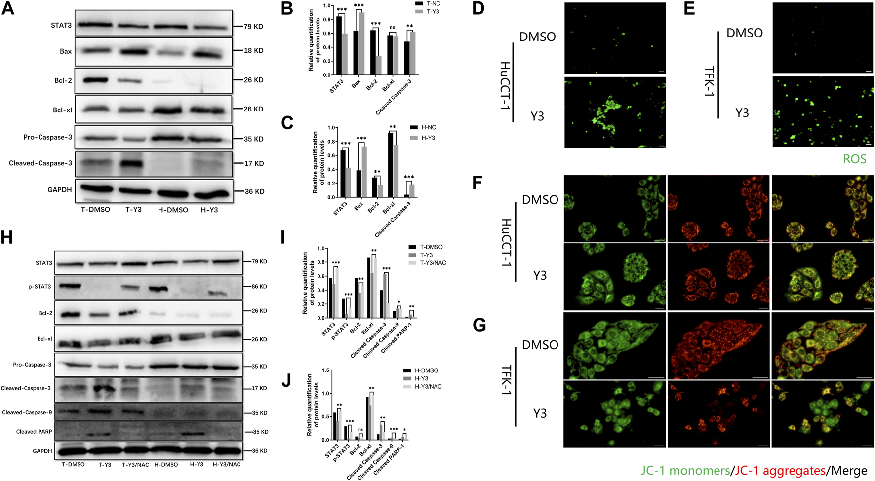 FIGURE 5. Y3 induces apoptosis by inhibiting STAT3 and ROS-mediated mitochondrial membrane potential transformation. WB and immunofluorescence results. (A–C) Western blotting analysis of the expression of STAT3 and apoptotic protein Caspase-3, Bax, Bcl-2 and Bcl-xl in HuCCT-1 and TFK-1 cells after 48 h treatment with Y3. GAPDH served as the loading control. (D, E) Fluorescence imaging was used to evaluate ROS generation in HuCCT-1 cell and TFK-1 cell after 48 h treatment with Y3. (F, G) HuCCT-1 and TFK-1 cells treated with Y3 were stained using JC-1 dye and examined using fluorescence microscopic analysis, green represents JC-1 monomers, red represents JC-1 aggregates, yellow represents merge images. (H–J) Western blotting analysis of the expression of STAT3, p-STAT3 and apoptosis related protein in HuCCT-1 cell and TFK-1 cell after treatment with Y3 or Y3+NAC. In the figure, the therapeutic concentration of Y3 for HuCCT-1 cell line was 0.1720uM, and that for TFK-1 cell line was 0.1034uM. *Represents p-value less than 0.05, **Represents p-value less than 0.01, ***Represents p-value less than 0.001, ns represent p-value greater than 0.05. Scale bars, 20 μm.