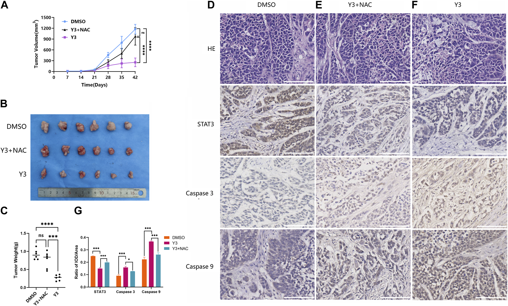 FIGURE 7. Y3 inhibited CCA progression in vivo. (A) Tumor volume in three groups of xenografted mice. Circle represents mice treated with 100ul PBS/d, square represents mice treated with Y3 40 mg/kg/d and volume of 100ul, the triangle represents mice treated with NAC + Y3, and 100 mg/kg/d NAC was given by gavage 2 h before Y3 (B) Xenograft tumors in the three groups. (C) The weight of the three groups of xenograft tumors. (D–F) HE staining and immunohistochemical images of STAT3, Caspase-3 and Caspase-9 in the three groups. (G) Immunohistochemical statistical results of STAT3, Caspase-3 and Caspase-9 in three groups. *Represents p-value less than 0.05, ***Represents p-value less than 0.001, ****Represents p-value less than 0.0001, ns represent p-value greater than 0.05. Scale bars, 100 μm.