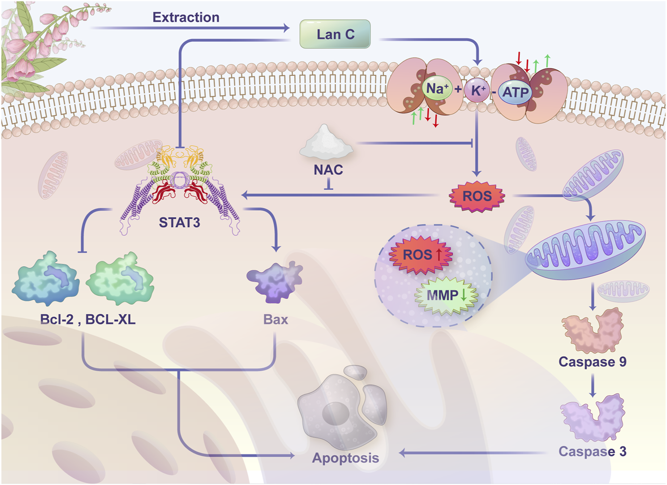 Cardiac glycosides comprise a large family of naturally derived compounds, such as Lan C, digoxin, digitalis toxin and ouabain, which share a common structural parent. Their core structure consists of a steroidal structure, widely thought to be responsible for the pharmacodynamic activity of these compounds (Whayne, 2018). Lan C and digoxin are closely related structurally, as digoxin can be obtained from the hydrolysis of the acetyl and glucose fractions from Lan C. The main pharmacological effect of cardiac glycosides, which are still widely used in clinical practice, is to inhibit cell membrane Na+/K+-ATPase and indirectly enhance myocardial contractility (Hood et al., 2014; Alpert, 2021). Recent studies have shown that several cardiac glycosides exert anticancer activity through different mechanisms, such as the SRC/EGFR/RAS/ERK signaling pathway, p21, NF-κB, AP-1, topoisomerase, and HIF-1 (Biggar et al., 2011; Biggar, 2012; Liu et al., 2020). These results suggest that cardiac glycosides has huge prospects for clinical application as an anticancer drug. In the present study, we explored the antitumor activity of Lan C in CCA and confirmed that Lan C has strong pro-apoptotic activity mediated by two pathways. On the one hand, increased intracellular ROS can induce a decrease in mitochondrial membrane potential, activating the mitochondrial apoptotic pathway. On the other hand, increased ROS inhibits the pro-oncogenic effect of STAT3, which leads to a decrease in Bcl-2 and Bcl-cl levels and an increase in Bax expression, ultimately causing apoptosis in CCA. Taken together, our findings suggest that ROS is an important target for treatment.