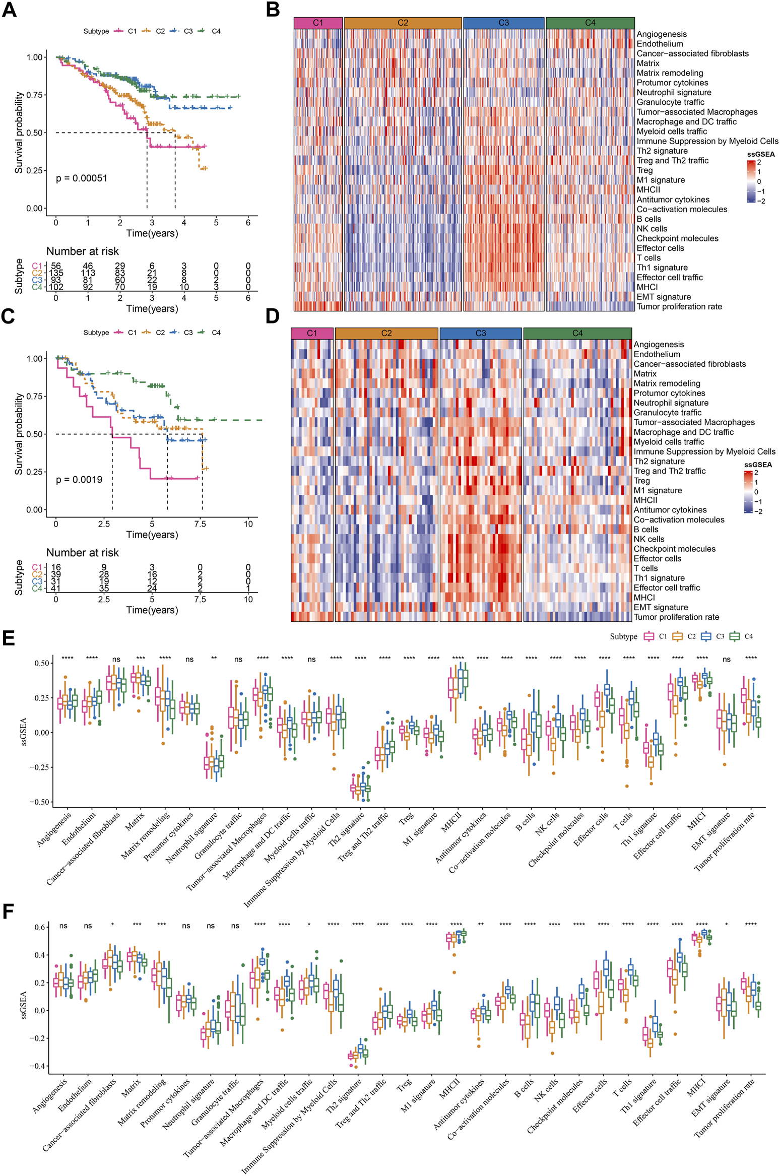 Additionally, similar results were carried out in hallmark pathways (Figure 4E). Cell cycle-related pathways were much enriched in C1 subtype. C2 subtype showed activated EMT, angiogenesis, hypoxia, Notch signaling, and TGF-β signaling. Immune-related pathways were significantly enriched in both C3 and C4 subtypes. Besides, C4 subtype also had relatively high enrichment of metabolic pathways such as heme metabolism, fatty acid metabolism, adipogenesis, xenobiotic metabolism, and bile acid metabolism. The above results implied that these differently enriched pathways may result in different TME characteristics in four subtypes.