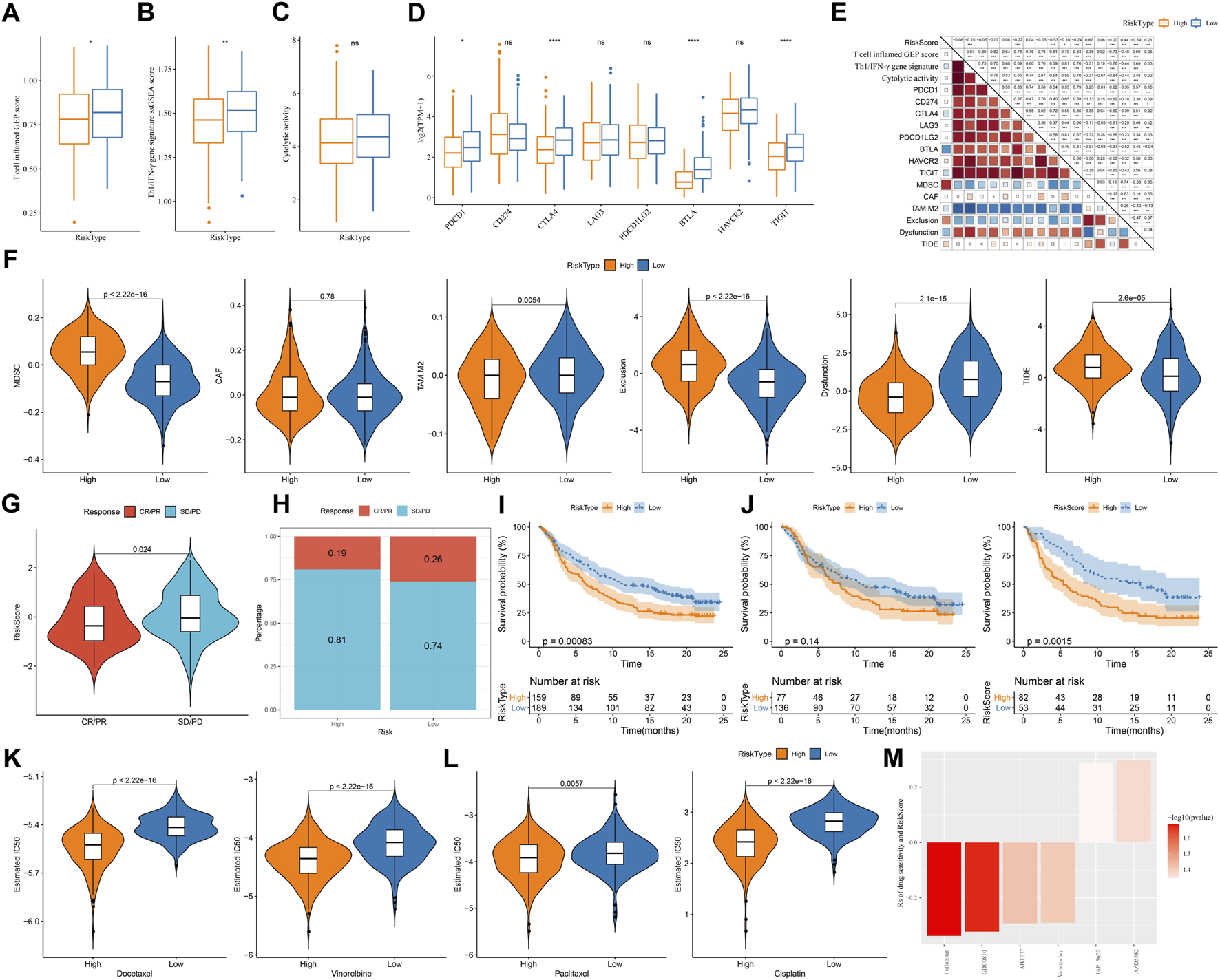 The predicted response to immunotherapy and chemotherapeutic drugs analyzed in TCGA and IMvigor210 datasets (A–C) The score of T cell inflamed GEP, Th1/IFN-γ signature, and cytolytic activity in two risk groups (D) The expression of immune checkpoint genes in two risk groups (E) TIDE analysis calculated the enrichment of immunosuppressive cells, T cell exclusion, T cell dysfunction, and TIDE score in two risk groups (F) Correlation of risk score with immunotherapy-related indicators (G) The risk score in CR/PR and SD/PD groups in IMvigor210 dataset (H) The proportion of CR/PR and SD/PD in two risk groups in IMvigor210 dataset (I–K) Survival plot of high-risk and low-risk groups in all stages (I), early stage (I+Ⅱ) (J), and late stage (Ⅲ+Ⅳ) (K) in IMvigor210 dataset (L) The estimated IC50 of four chemotherapeutic drugs in two risk groups (M) Drug sensitivity of potential drugs in the relation to the risk score. Rs < 0 indicates drug sensitivity and Rs > 0 indicates drug resistance.