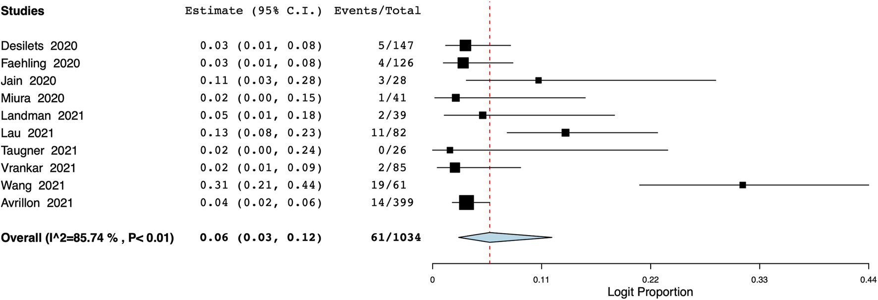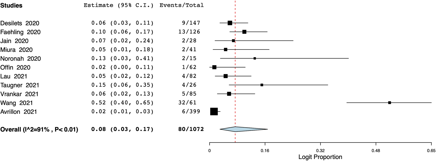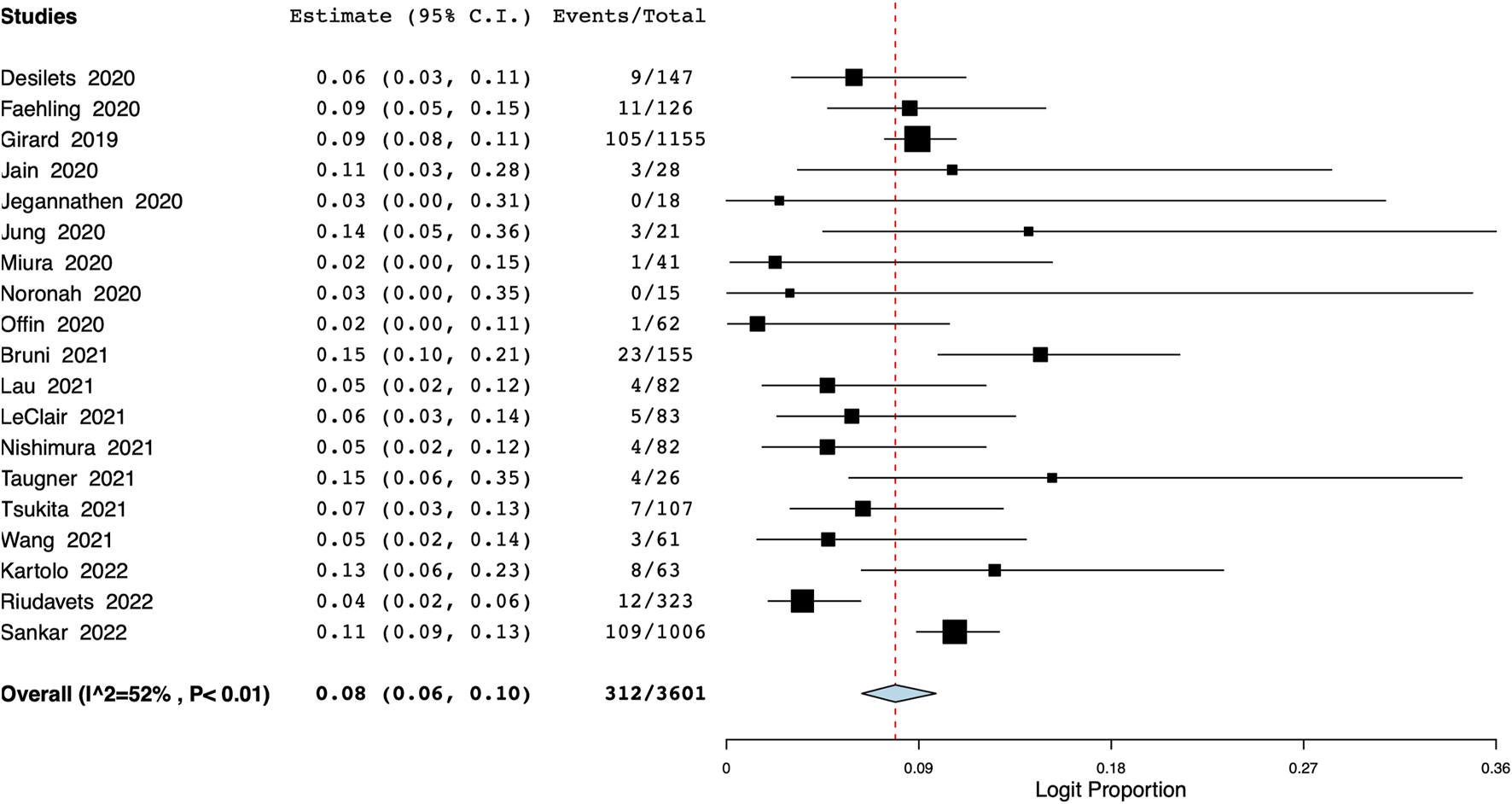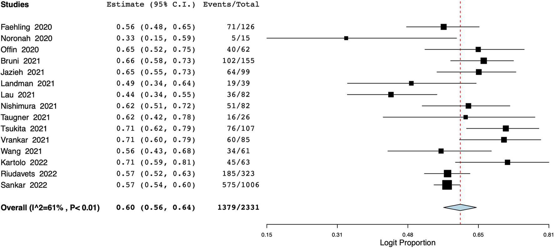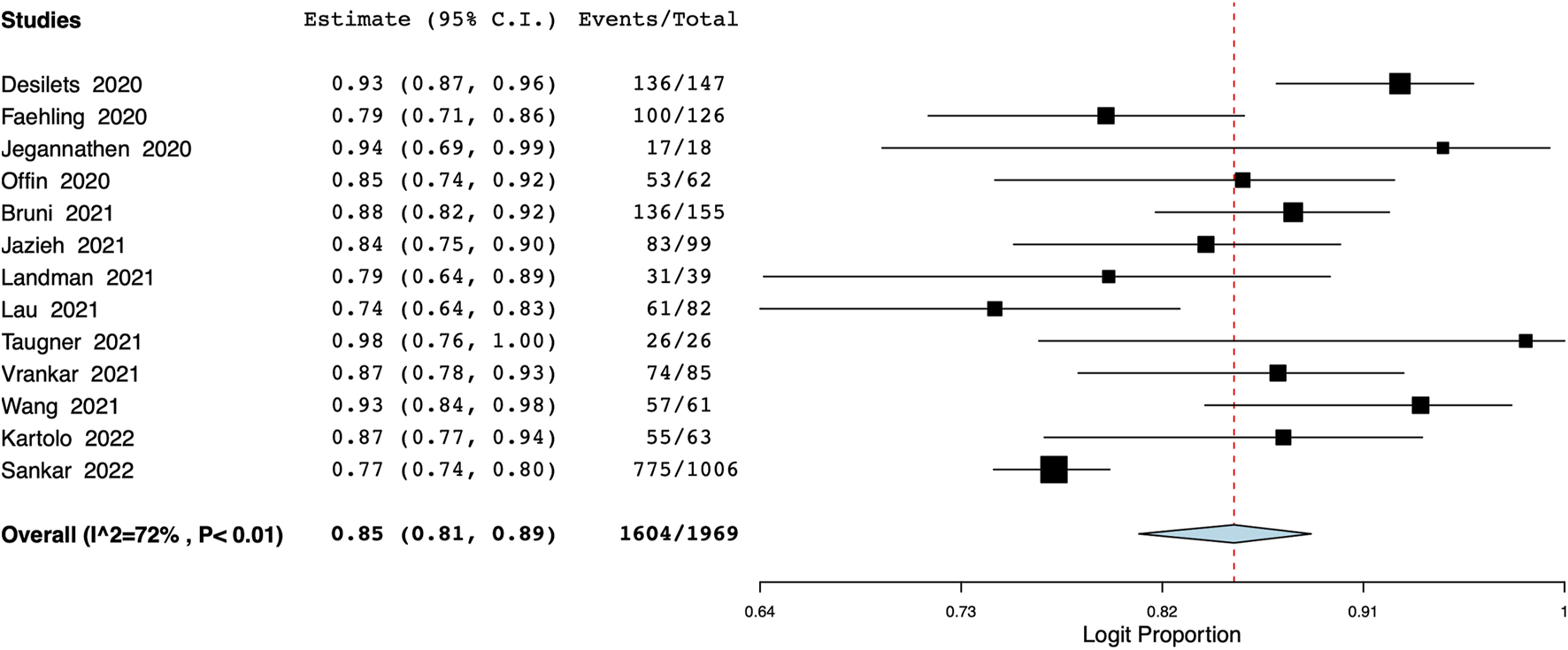 Data on 1-year OS was available from 14 studies with 1969 participants. Meta-analysis indicated a 1-year OS of 85% (95% CI: 81%–89%) (Figure 2). Inter-study heterogeneity was 72%. There was not much variation in the leave-one-out analysis with the estimate ranging from 84% to 86% (Supplementary Figure S1). On the subgroup analysis, the 1-year OS was 83% (95% CI: 79%–87%) in studies of the Western population and 88% (95% CI: 67%–96%) in the Asian population (Supplementary Figure S2). Based on the number of study centers, the OS was 83% (95% CI: 77%–87%) in single-center studies and 85% (95% CI: 79%–90%) in multicentric studies (Supplementary Figure S3). Results of the meta-regression analysis are presented in Table 2. None of the moderators were found to significantly influence the effect size. The bubble plots of the meta-regression are presented as Supplementary Figures S4–S8.