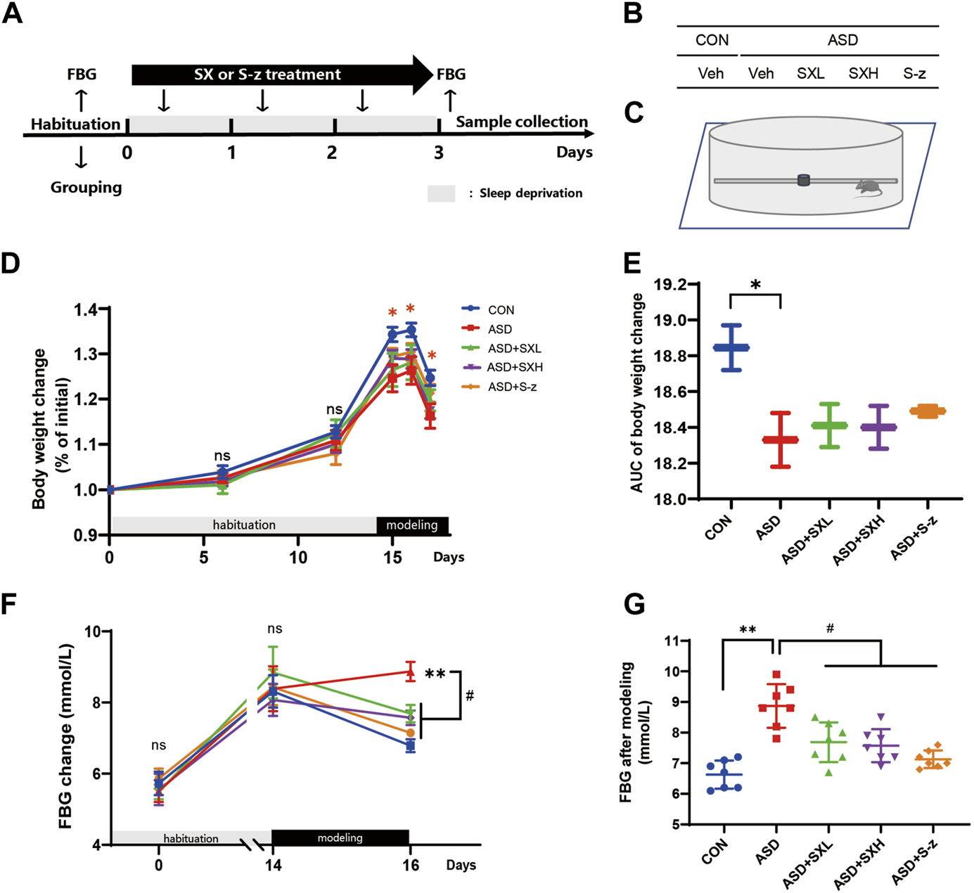 In the present study, we established an acute sleep deprivation model in C57BL/6J mice using the horizontal bar-style automated sleep deprivation system (Figure 1A). The ASD group mice gradually developed clinical symptoms of gastrointestinal dysfunction such as undigested stool, passivity, irritability, decreased appetite, disordered hair, and decreased body mass (p < 0.05, Figures 1D, E; Supplementary Tables S1–S9). The fasting blood glucose (FBG) levels in the ASD group mice were significantly higher than the CON group mice (p < 0.01, Figures 1F, G; Supplementary Tables S1–S9), but these effects were partially reversed in the ASD + SXH/SXL (high and low dose) and the ASD + S-z group mice (Figures 1F, G; Supplementary Tables S1–S9). The ASD group mice showed significant body weight loss compared to the CON group mice, but the body weights of the ASD + SXH/SXL (high and low dose) were not significantly higher than the ASD group mice (Figure 2C). Furthermore, fasting blood glucose (FBG) levels were significantly higher in the ASD group mice compared to the CON group, but were significantly lower in the ASD + SXH/SXL (high and low dose) and the ASD + S-z group mice compared to the ASD group (Figure 1G).