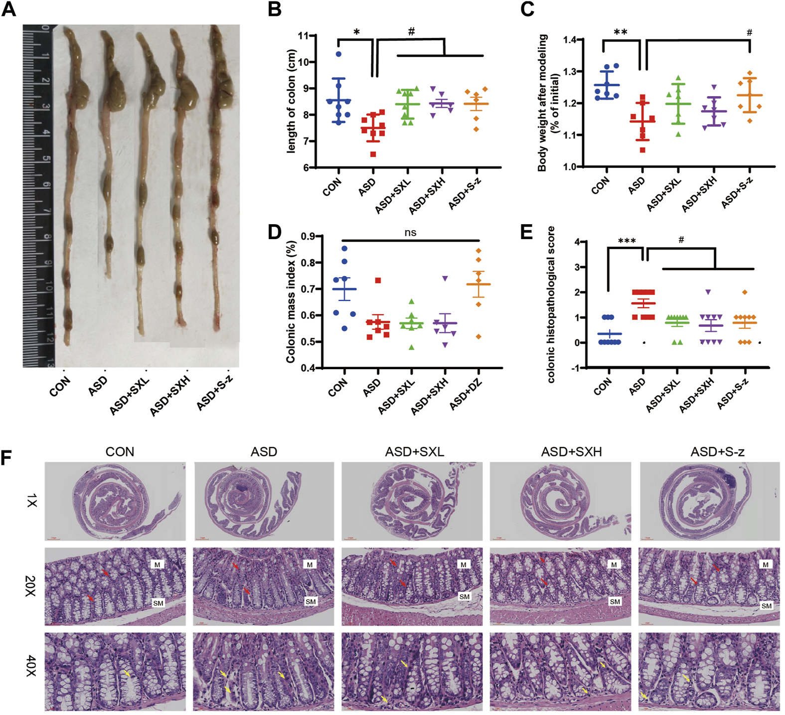 SX alleviates acute sleep deprivation-induced histopathological injury in the colon. (A) Representative images show the lengths of colons harvested from the CON, ASD, ASD + SXL, ASD + SXH, and ASD + S-z groups of mice. (B) Quantitative data shows the colon lengths of mice belonging to the CON, ASD, ASD + SXL, ASD + SXH, and ASD + S-z groups. (C) Body weights of the CON, ASD, ASD + SXL, ASD + SXH, and ASD + S-z group mice after modeling. (D) Colon mass indices (%) (colonic weight/body weight) of the CON, ASD, ASD + SXL, ASD + SXH, and ASD + S-z groups of mice. (E) The colon histopathological scores of the CON, ASD, ASD + SXL, ASD + SXH, and ASD + S-z group mice. p < 0.05, ASD vs. SXL, SXH and S-z. (F) Representative H&E-stained images show the morphological changes in the colon mucosa of mice belonging to the CON, ASD, ASD + SXL, ASD + SXH, and ASD + S-z groups (×1, ×20, and ×40 magnification). M: mucosa; SM: submucosa; red arrow: multiple mucinous glands; yellow arrow: inflammatory cells. Data were expressed as means ± SEM. n = 6–7 per group. Statistical significance was determined by one-way ANOVA; *p < 0.05 vs. control group; #p < 0.05 vs. ASD group; ns, no significant.
