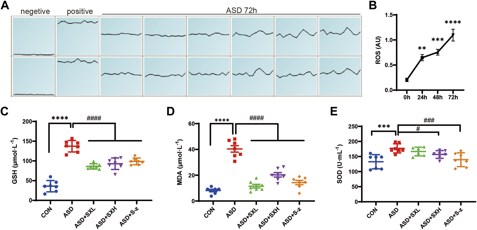SX alleviates ASD-induced oxidative stress in the mouse serum. (A) (A). ROS fluorescence intensity of blood cells after 72 h of ASD, waveforms are images obtained in “multi-point scanning” mode for each well, with the top and bottom wells being multiple wells. The average of each well was taken for statistical analysis. Positive control Rosup concentration was 100 μM. (B). Fluorescence intensity before and after ASD was measured at 488 nm excitation wavelength and 535 nm emission wavelength, time point by time point (0, 24, 48, 72 h). (B) ROS levels in the blood cells of ASD group mice at 0, 24, 48, and 72 h. (C) Serum GSH levels in the CON, ASD, ASD + SXL, ASD + SXH, and ASD + S-z groups of mice. p < 0.0001, ASD vs. SXL, SXH, S-z. (D) Serum MDA levels in the CON, ASD, ASD + SXL, ASD + SXH, and ASD + S-z groups of mice. p < 0.0001, ASD vs. SXL, SXH, S-z. (E) Total SOD activity in the serum of CON, ASD, ASD + SXL, ASD + SXH, and ASD + S-z groups of mice. p < 0.05, ASD vs. SXH; p < 0.001 ASD vs. S-z. The data are represented as means ± SEM. n = 7 each group. Statistical significance was determined based on one-way ANOVA; ****p < 0.0001, ***p < 0.001, **p < 0.01 vs. CON group; ####p < 0.0001, ###p < 0.001, ##p < 0.01, #p < 0.05 vs. ASD group.