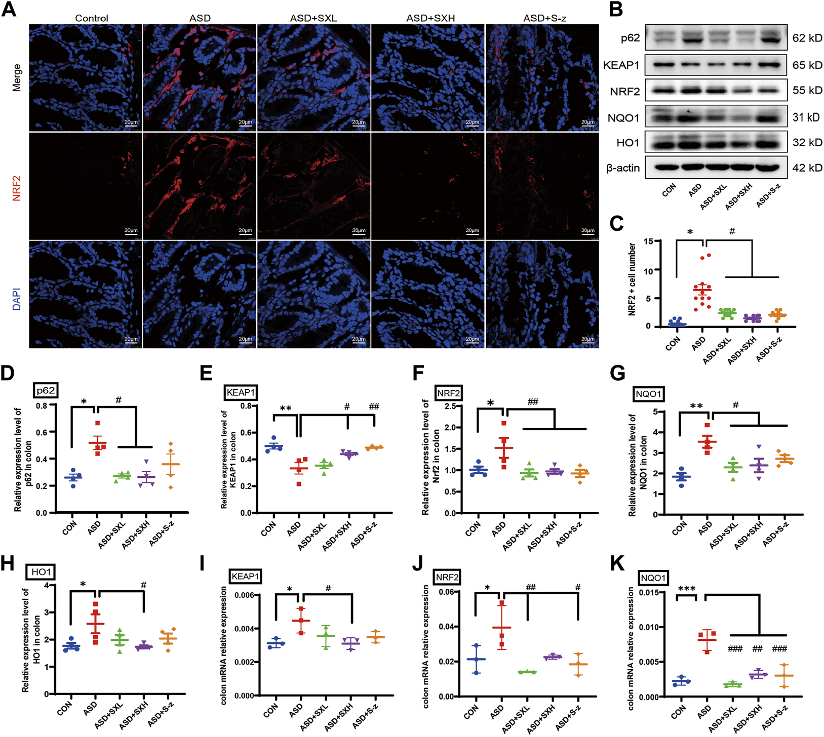 SX modulates ASD-induced oxidative stress in the colon through the p62/KEAP1/NRF2/HO1/NQO1 signaling pathway. (A) Representative immunofluorescence images show the localization of NRF2 protein in the colon sections based on staining with the fluorophore-labeled anti-NRF2 antibody (red fluorescence). The nuclei are stained with DAPI (blue fluorescence). (B) Representative western blot shows the expression levels of p62, KEAP1, NRF2, NQO1, HO1, and β-actin proteins in the colons of mice belonging to the CON, ASD, ASD + SXL, ASD + SXH, and ASD + S-z groups. β-actin was used as the internal loading control. The experiment was repeated three times. (C) The dot plot shows the numbers of NRF2 positive cells (based on immunofluorescence staining in A) in the colonic mucosa of mice belonging to the CON, ASD, ASD + SXL, ASD + SXH, and ASD + S-z groups. p < 0.05, ASD vs. SXL, SXH, and S-z. (D–H) The relative expression levels of p62, KEAP1, NRF2, NQO1, and HO1 proteins compared to the β-actin protein levels in the colons of mice belonging to the CON, ASD, ASD + SXL, ASD + SXH, and ASD + S-z groups. Note: for p62 in (D), p < 0.05, ASD vs. SXL, SXH; p = 0.4302, ASD vs. S-z); for KEAP1 in (E), p < 0.05 ASD vs. SXH; p < 0.01 vs. S-z); for NRF2 in (F), p < 0.01, ASD vs. SXL, SXH, and S-z); for NQO1 in (G), p < 0.05, ASD vs. SXL, SXH, and S-z; for HO1 in (H)p < 0.05, ASD vs. SXH); (I–K) qRT-PCR results show the transcript levels of KEAP1, NRF2, and NQO1 compared with the β-actin transcript levels. For KEAP1 in (I), p < 0.05, ASD vs. SXH; for NRF2 in (J), p < 0.01 ASD vs. SXL; p < 0.05, ASD vs. S-z; for NQO1 in (K), p < 0.001 ASD vs. SXL and S-z; p < 0.01, ASD vs. SXH; KEAP1, Kelch-like ECH-associated protein 1; NRF2, nuclear factor erythroid 2-related factor 2; NQO1, NAD(P)H: quinone oxidoreductase 1; HO1, heme oxygenase 1; Data are expressed as means ± SEM. n = 4 per group. Statistical significance was determined by one-way ANOVA; *p < 0.05, **p < 0.01 vs. CON; #p < 0.05, ##p < 0.01 vs. ASD. ns, no significant. Scale bar: 20 μm.