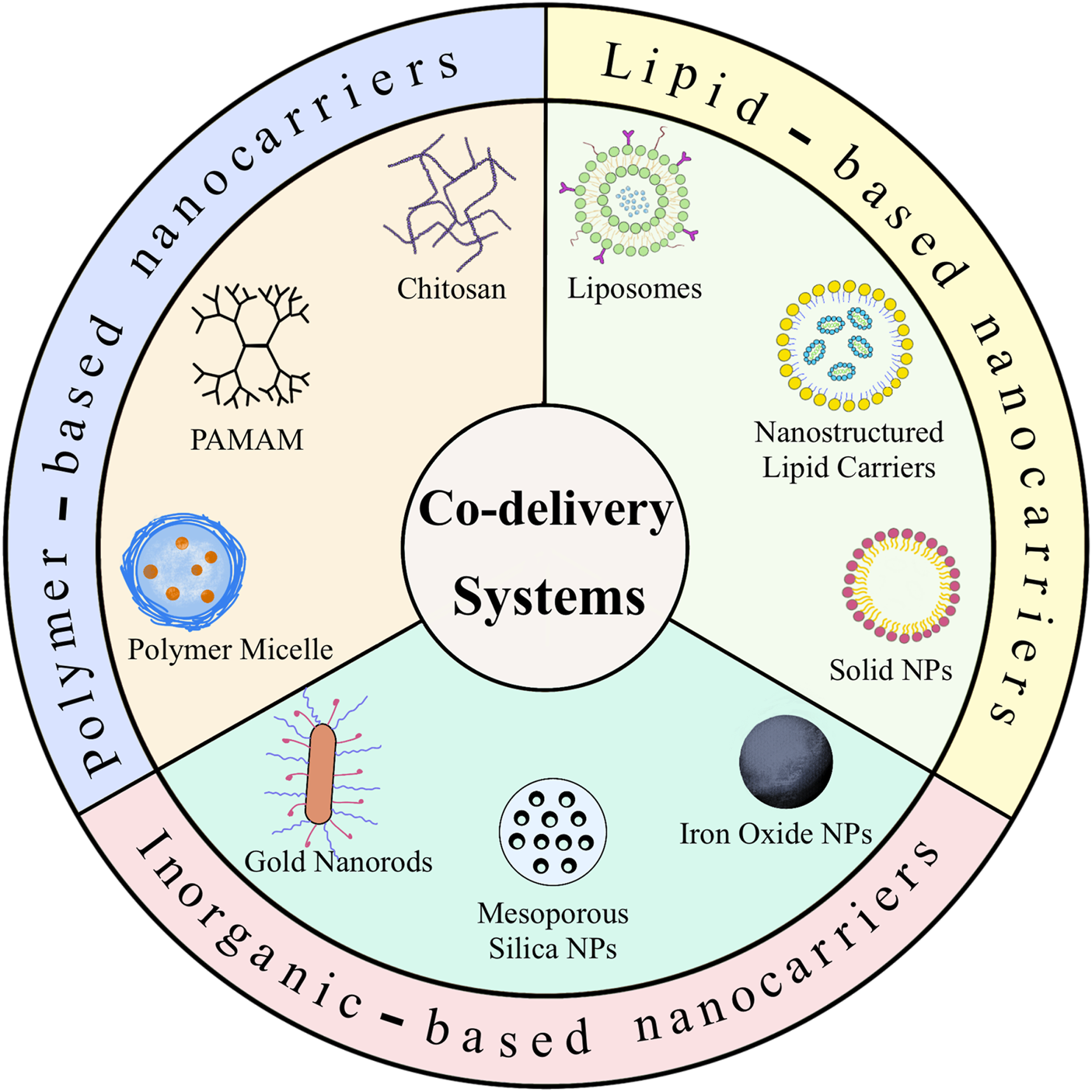 Alternative materials such as lipids, polymers and inorganic nano-systems have been used to fabricate these co-delivery nanoparticles. This review introduces the recent advances in co-delivery nanocarriers for cancer treatment, as shown in Figure 1, including i) the basic delivery strategy responding to several specific situations; ii) the preparation of three different materials for nanocarriers and successful applications of co-delivery; iii) a discussion of the value of this new approach, the future prospects and technical challenges in this field.