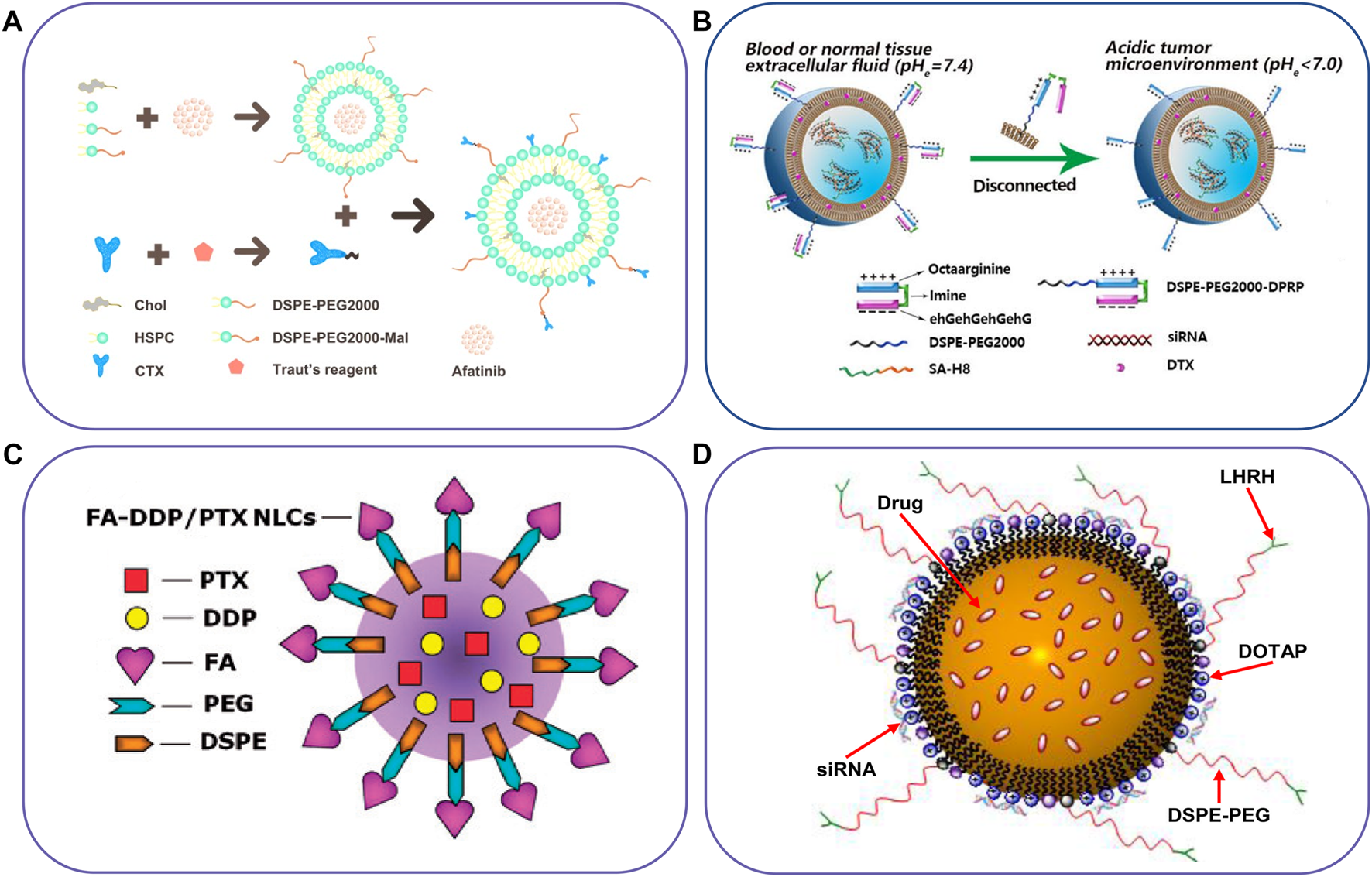 FIGURE 2. Schematic illustration of lipid-based nanocarriers to co-deliver two different agents. (A) Immunoliposome to deliver AFT and CTX, (B) pH-responsive liposome co-delivery DTX and siRNA, (C) FA-targeted NLC for co-delivery of DDP and PTX, and (D) NLC for co-delivery of an anticancer drug, siRNA and targeting peptide. Reproduced with permission from ref. (Lu et al., 2019), (Zhao et al., 2022), (Yang et al., 2016), (Taratula et al., 2013). Copyright 2019, 2022, 2016 and 2013, Elsevier, BioMed Central, Taylor & Francis, and Elsevier, respectively.