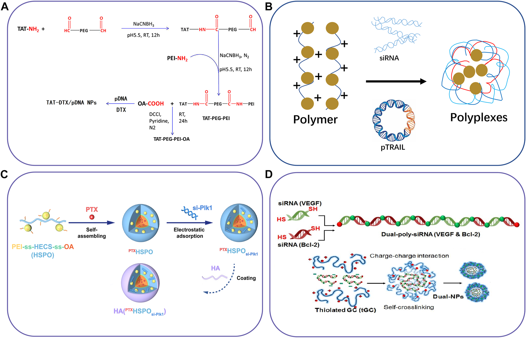 FIGURE 3. Schematic illustration of polymer-based nanocarriers to co-deliver two different agents. (A) The synthetic route of TAT-PEG-PEI-OA for co-deliver of DTX and pDNA, (B) lipopolymers to delivery pDNA and siRNA, (C) Chitosan derivatives for co-delivery of siRNA and PTX, and (D) Thiolated glycol chitosan for co-delivery of Dual-poly-siRNA. Reproduced with permission from ref. (Dong et al., 2016), (Thapa et al., 2019), (Yin et al., 2020), (Lee et al., 2015). Copyright 2016, 2019, 2020 and 2015, Elsevier, Mary Ann Liebert, American Chemical Society, and Elsevier, respectively.