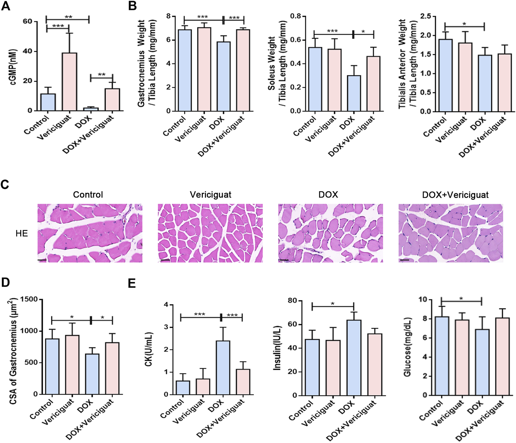 Vericiguat alleviated skeletal muscle atrophy and muscle injury. (A) Detection of cGMP content in mice by Elisa. (B) The ratios of the gastrocnemius muscle, soleus muscle, and tibialis anterior muscle weight to tibia length (mg/mm). (C) Representative HE staining of gastrocnemius muscle CSA (Scale bar: 50 μm). (D) CSA of gastrocnemius muscle fibres in different treatment (μm2). (E) Serum levels of CK, insulin and glucose. n = 5–7; *p < 0.05, **p < 0.01, ***p < 0.001.
