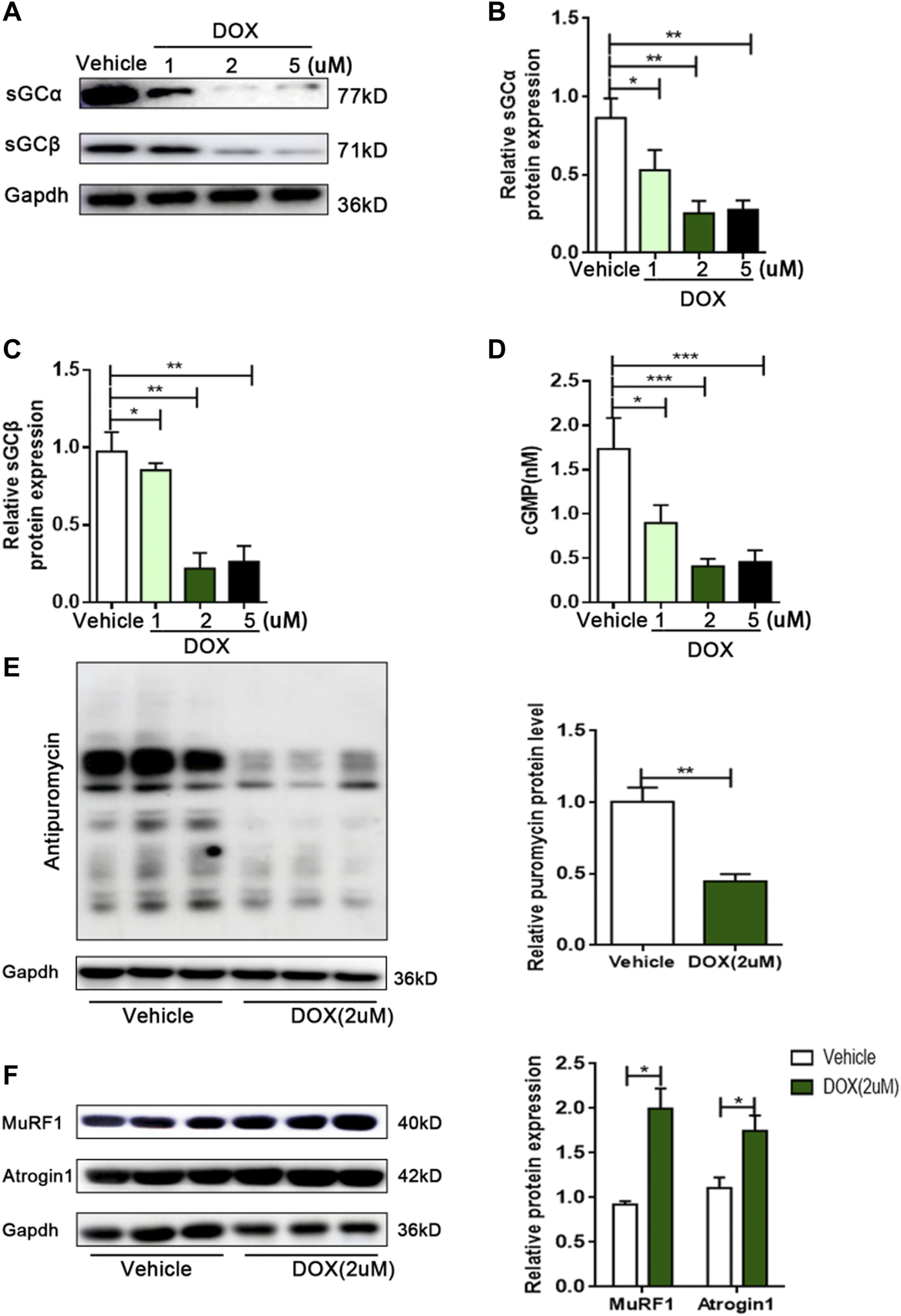 DOX leads to decreased sGC activity, decreased protein synthesis, and increased protein degradation in C2C12 myotubes. (A) Representative of western blot images of sGCα and sGCβ expressions in C2C12 cells treated with the vehicle DMSO or 1, 2 and 5 μM DOX for 24 h. (B) Quantification of the relative levels of sGCα proteins from panel (A). (C) Quantification of the relative levels of sGCβ proteins from panel (A). (D) Detection of cGMP content in C2C12 myotubes by Elisa. (E) Representative immunoblots of puromycin incorporation in C2C12 myotubes treated with 2 μM DOX. (F) Representative immunoblots of MuRF1 and Atrogin1 in C2C12 myotubes treated with 2 μM DOX. n = 3; *p < 0.05, **p < 0.01, ***p < 0.001.