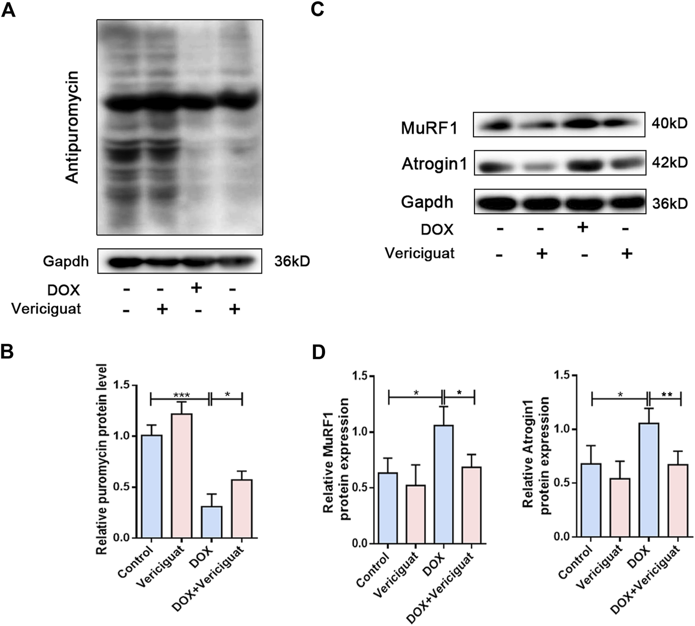 Methods: Mice were randomly divided into four groups: control group, vericiguat group, DOX group, and DOX + vericiguat group. Exercise capacity was evaluated before the mice were sacrificed. Skeletal muscle atrophy was assessed by histopathological and molecular biological methods. Protein synthesis and degradation were monitored in mice and C2C12 cells.