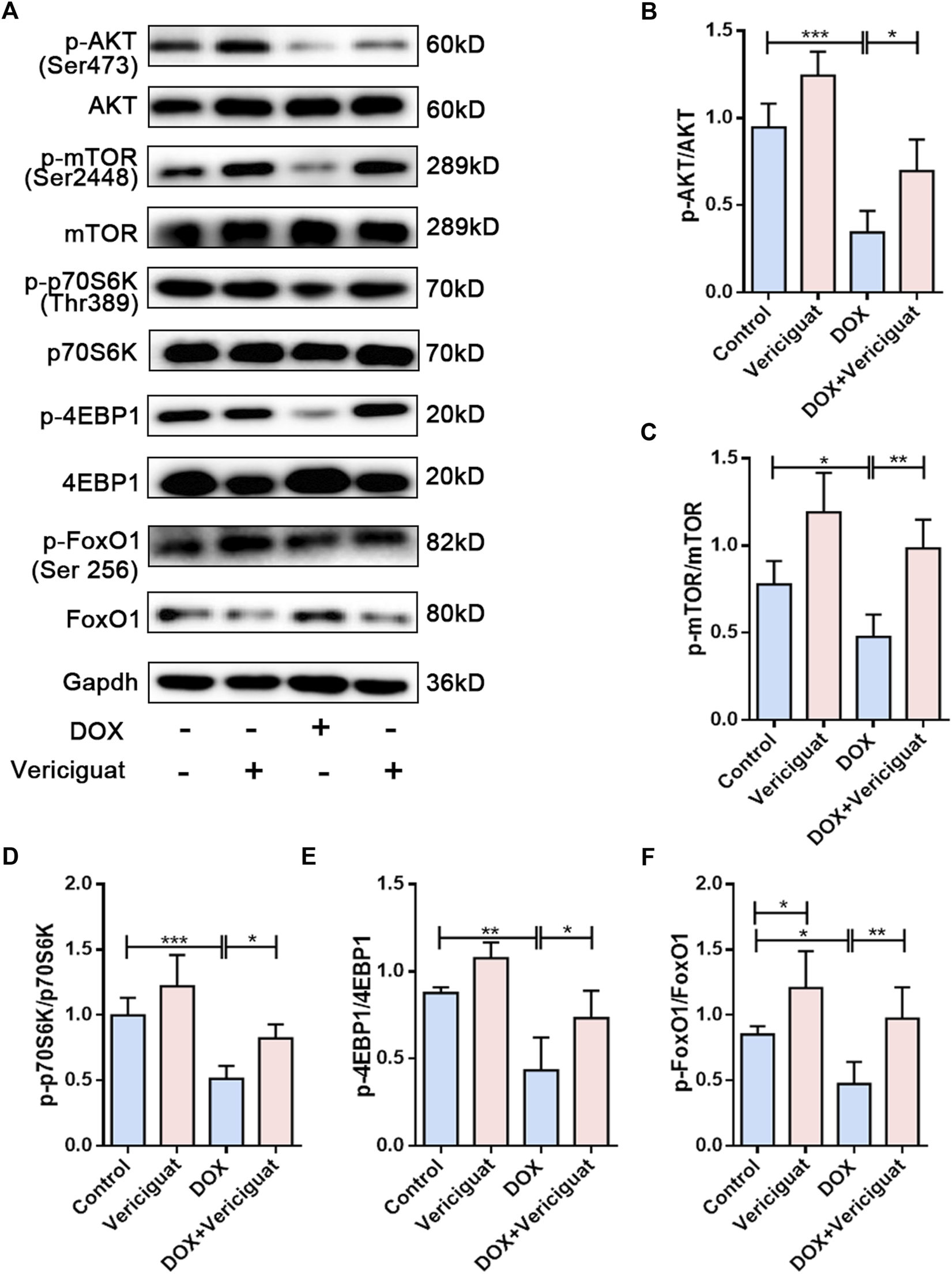 Vericiguat restored AKT/mTOR and FoxO1 pathways in DOX mice. (A) Expression of p-AKT, AKT, p-mTOR, mTOR, p-p70S6K, p70S6K, p-4EBP1, 4EBP1, p-FoxO1 and FoxO1 detected through western blot. (B–F) Relative protein expression levels of p-AKT, AKT, p-mTOR, mTOR, p-p70S6K, p70S6K, p-4EBP1, 4EBP1, p-FoxO1 and FoxO1. n = 5; *p < 0.05, **p < 0.01, ***p < 0.001.