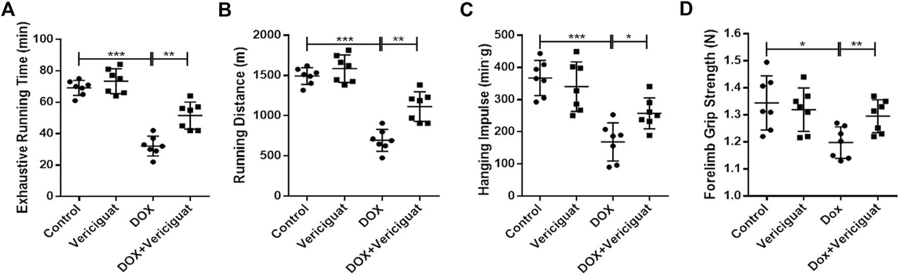 Veirciguat improved the decrease of exercise ability by DOX in mice. (A) Exhaustive running time (min). (B) Running distance (m) (C) Hanging impulse (min.g). (D) Forelimb grip strength (N). n = 7; *p < 0.05, **p < 0.01, ***p < 0.001.