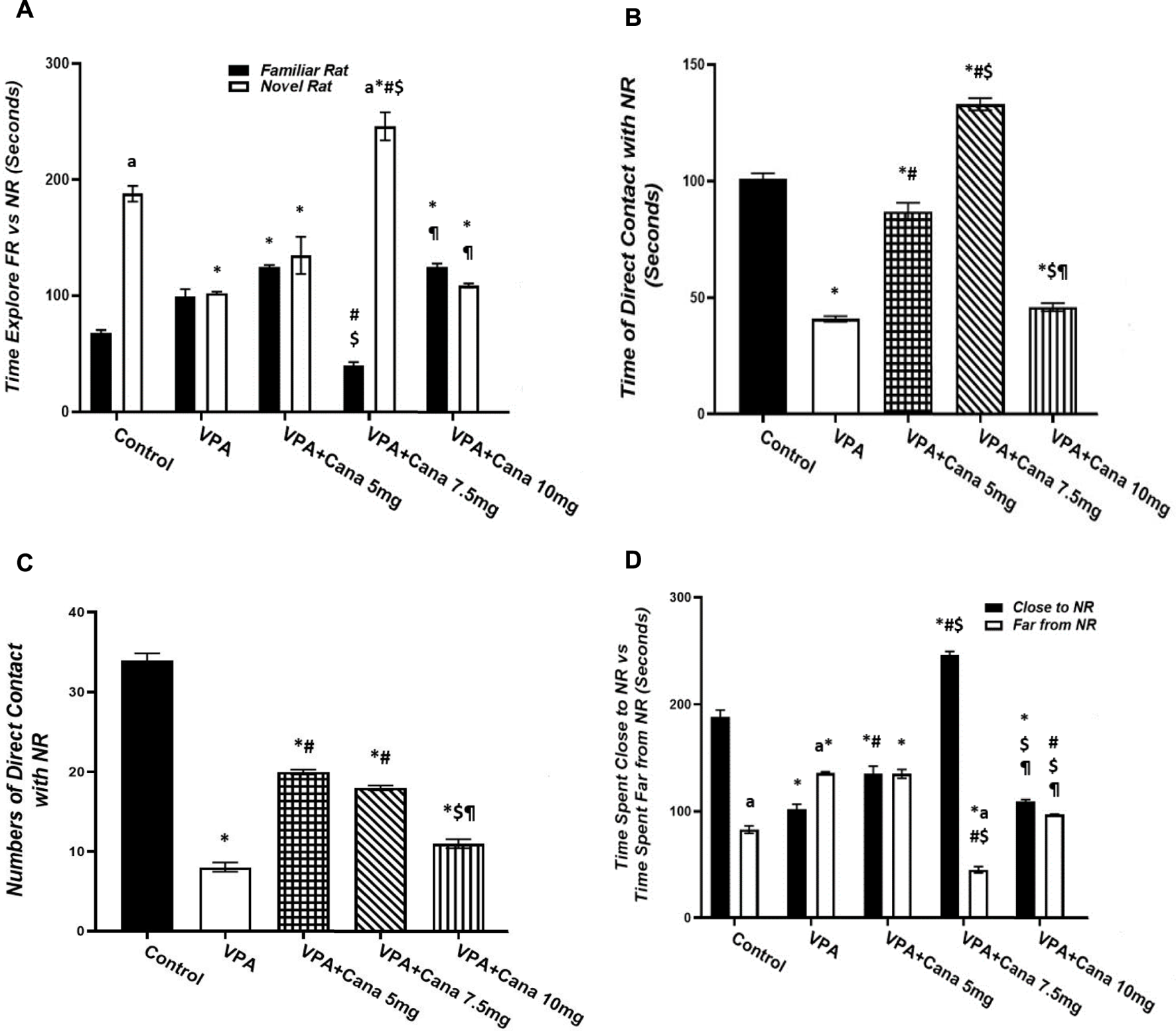 Valproic acid injected SC at a dosage of 300 mg/kg resulted in less time spent and a reduced number of direct contact with novel rats compared with vehicle-injected rats (p < 0.05, Figures 2B, C). However, coadministration of Cana at doses of 5 and 7.5 mg/kg with VPA increased the time spent in direct contact with novel rats compared to the VPA-treated group (p < 0.05, Figures 2B, C).