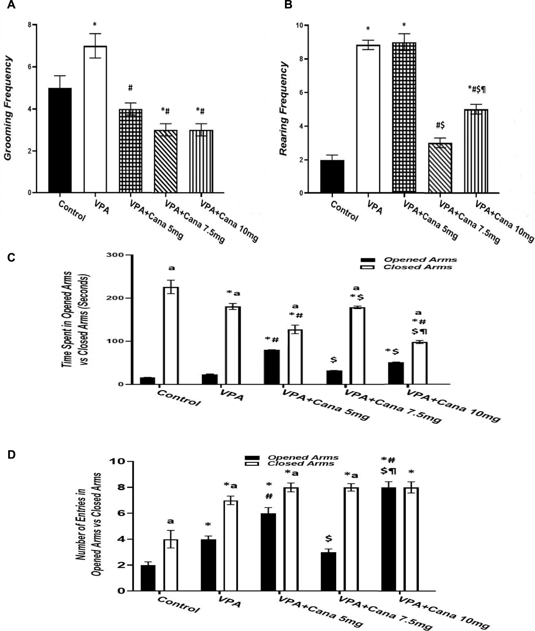 Effect of canagliflozin (5 mg/kg, 7.5 mg/kg, and 10 mg/kg) on elevated plus-maze (EPM) test; grooming (A), rearing (B), time spent in opened arms versus closed arms (C), and number of entries in opened arms versus closed arms (D). VPA, valproic acid; Cana, canagliflozin. Values are expressed as mean ± S.E.M. Results represented in Figures 3A, B were analyzed using one-way ANOVA, followed by Tukey’s post hoc multiple comparisons test. Results represented in Figures 3C, D were analyzed using two-way ANOVA, followed by Tukey’s post hoc multiple comparisons test. * Compared to the corresponding control group at p < 0.05, # compared to the corresponding VPA group at p < 0.05, $ compared to the corresponding VPA + Cana (5 mg/kg) group at p < 0.05, ¶ compared to the corresponding VPA + Cana (7.5 mg/kg) group, a compared to time spent in opened arms (C) and number of entries in opened arms (D) at p < 0.05, n = 8, for all groups except for the control group, n = 10.