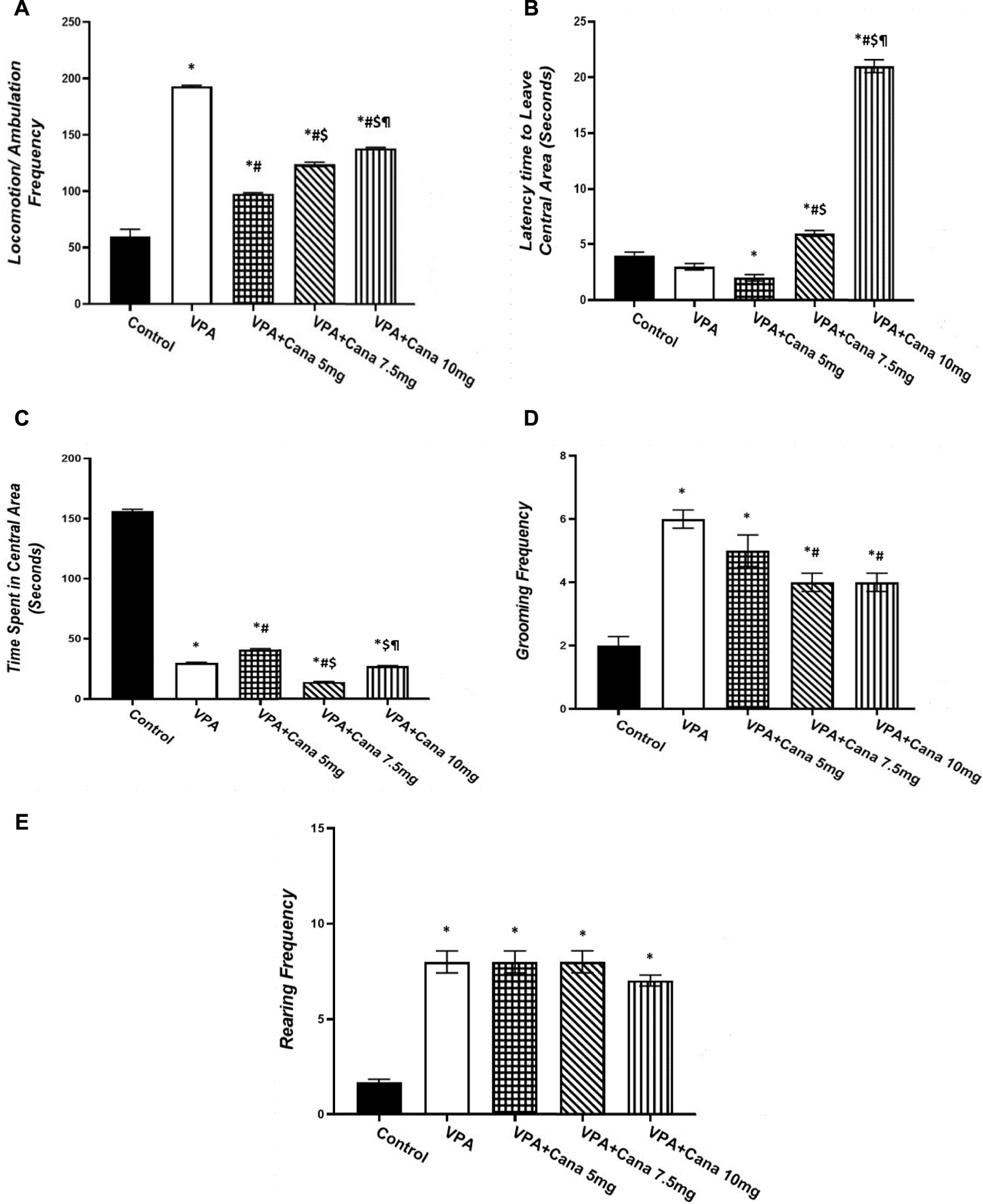 Valproic acid injection to pups at a dose of 300 mg/kg raised locomotor activity (p < 0.05, Figure 4A), inhibited the time spent in the central area (p < 0.05, Figure 4C), and increased the number of groomings and rearings compared to the vehicle-treated rats (p < 0.05, Figures 4D, E). Oral treatment with Cana (5 mg/kg, 7.5 mg/kg, and 10 mg/kg) reduced locomotion compared with the VPA-injected group (p < 0.05, Figure 4A), with Cana (5 mg) displaying the highest decrease. Moreover, Cana (7.5 mg/kg and 10 mg/kg) prolonged the time to leave the central area in comparison with the VPA-treated group (p < 0.05, Figure 4B), with Cana (10 mg) pointing to the highest increase. In addition, Cana (7.5 mg and 10 mg) showed the same significant decrease in groomings compared with the VPA-treated group (p < 0.05, Figure 4D). However, Cana at a 5 mg/kg dose only increased the time spent in the central area compared to the VPA-treated group (p < 0.05, Figure 4C). All Cana doses displayed no significant difference in rearings compared to the induction group (Figure 4E).