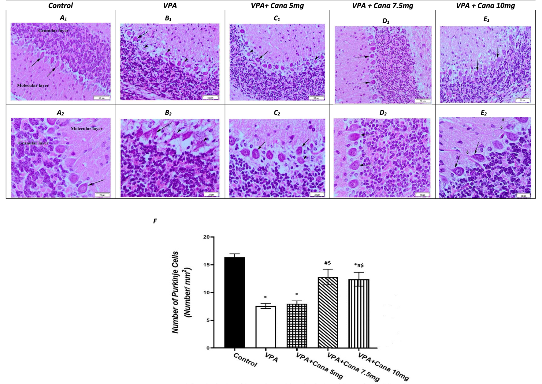 Effect of canagliflozin (5 mg/kg, 7.5 mg/kg, and 10 mg/kg) on the histopathological picture of the cerebellum tissues of the brain in VPA-induced autism in rats. Hematoxylin and eosin stain (50 µm and 20 µm) (A–E). Number of Purkinje cells of the experimental groups (F). VPA, valproic acid; Cana, canagliflozin. Values are expressed as mean ± S.E.M and analyzed using one-way ANOVA, followed by Tukey’s post hoc multiple comparisons test. * Compared to the corresponding control group at p < 0.05, # compared to the corresponding VPA group at p < 0.05, $ compared to the corresponding VPA + Cana (5 mg/kg) group at p < 0.05, ¶ compared to the corresponding VPA + Cana (7.5 mg/kg) group at p < 0.05, n = 8, for all groups except for the control group, n = 10.