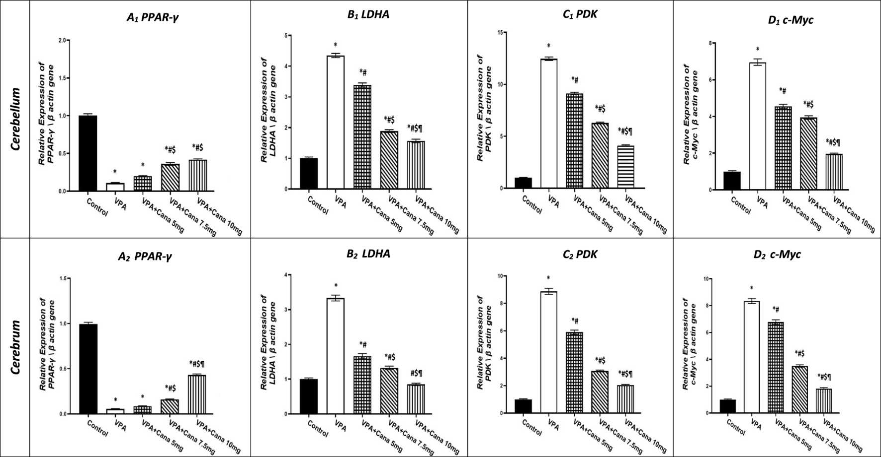 Effect of canagliflozin (5 mg/kg, 7.5 mg/kg, and 10 mg/kg) on the expression of PPAR-γ (A), LDHA (B), PDK (C), and c-Myc (D) gene in the cerebellum and cerebrum tissues of VPA-induced autism in rats. VPA, valproic acid; Cana, canagliflozin. Results are expressed as mean ± S.E.M and analyzed using one-way ANOVA, followed by Tukey’s post hoc multiple comparisons test. * Compared to the corresponding control group at p < 0.05, # compared to the corresponding VPA group at p < 0.05, $ compared to the corresponding VPA + Cana (5 mg/kg) group at p < 0.05, ¶ compared to the corresponding VPA + Cana (7.5 mg/kg) group at p < 0.05, n = 8, for all groups except for the control group, n = 10.