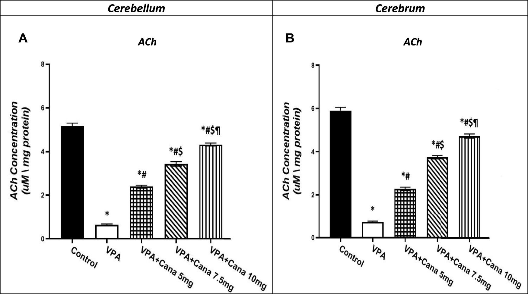 Cerebrum and cerebellum ACh concentrations were measured by the colorimetric method using sandwich ELISA Kits (catalog #E4452, BioVision Inc.®) (catalog # ab287811) (Milpitas, CA, United States), and expressed as µmol/mg protein according to the manufacturer’s instructions.