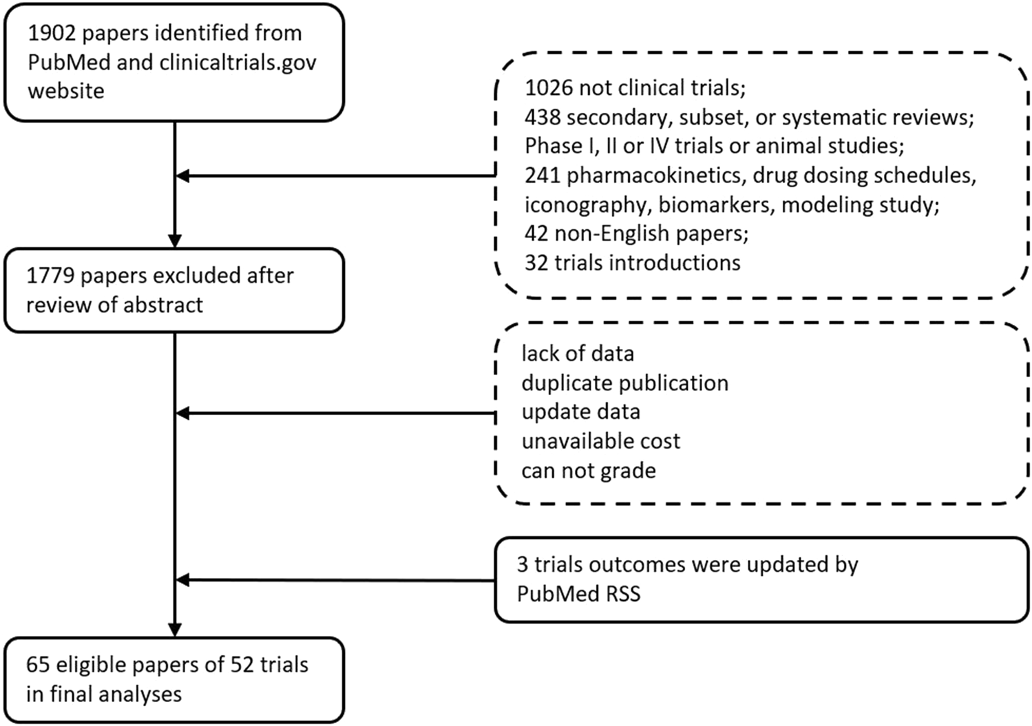 To assess the monthly cost of therapeutic regimen including the cost of all anticancer drugs in the study regimen, we used the United States average wholesale prices (AWP) for drugs from the RedBook (IBM Micromedex, Armonk, NY, United States). Monthly costs were calculated over an average of 28 days based on the dosage schedule in all eligible trials for a patient weighing 70 kg with a body surface area of 1.86 m2 and creatinine clearance of 100 mL/min (Wan et al., 2019). Ultimately, incremental monthly drug costs between the experimental and control groups were reported. All therapeutic regimens were adjusted to provide the price per 4-week period.
