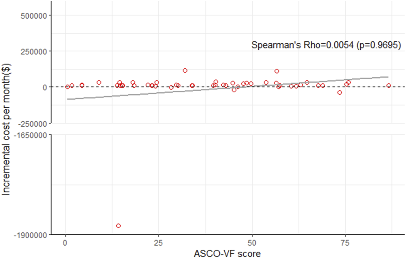 The incremental monthly drug costs (the cost of the experimental group minus the cost of the control group) of PD-1/PD-L1 inhibitors and the ASCO-VF score were not statistically significant correlated in all trials (Spearman’s ρ = 0.0054, p = 0.9695, Figure 2), the subgroup of palliative treatments (ρ = −0.0396, p = 0.3946), and curative treatments (ρ = 0.6324, p = 0.184) (Supplementary Figure S2).
