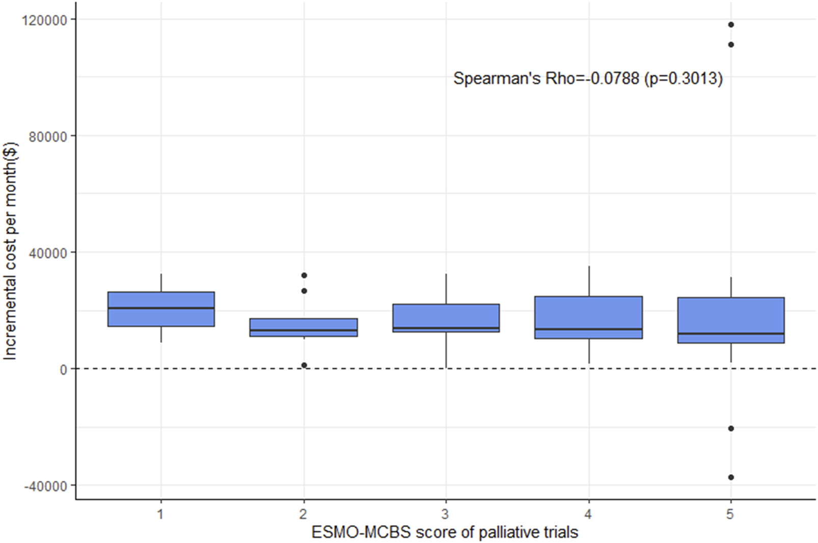 Boxplot of correlation between ESMO-MCBS scores and incremental cost per month in palliative trials.