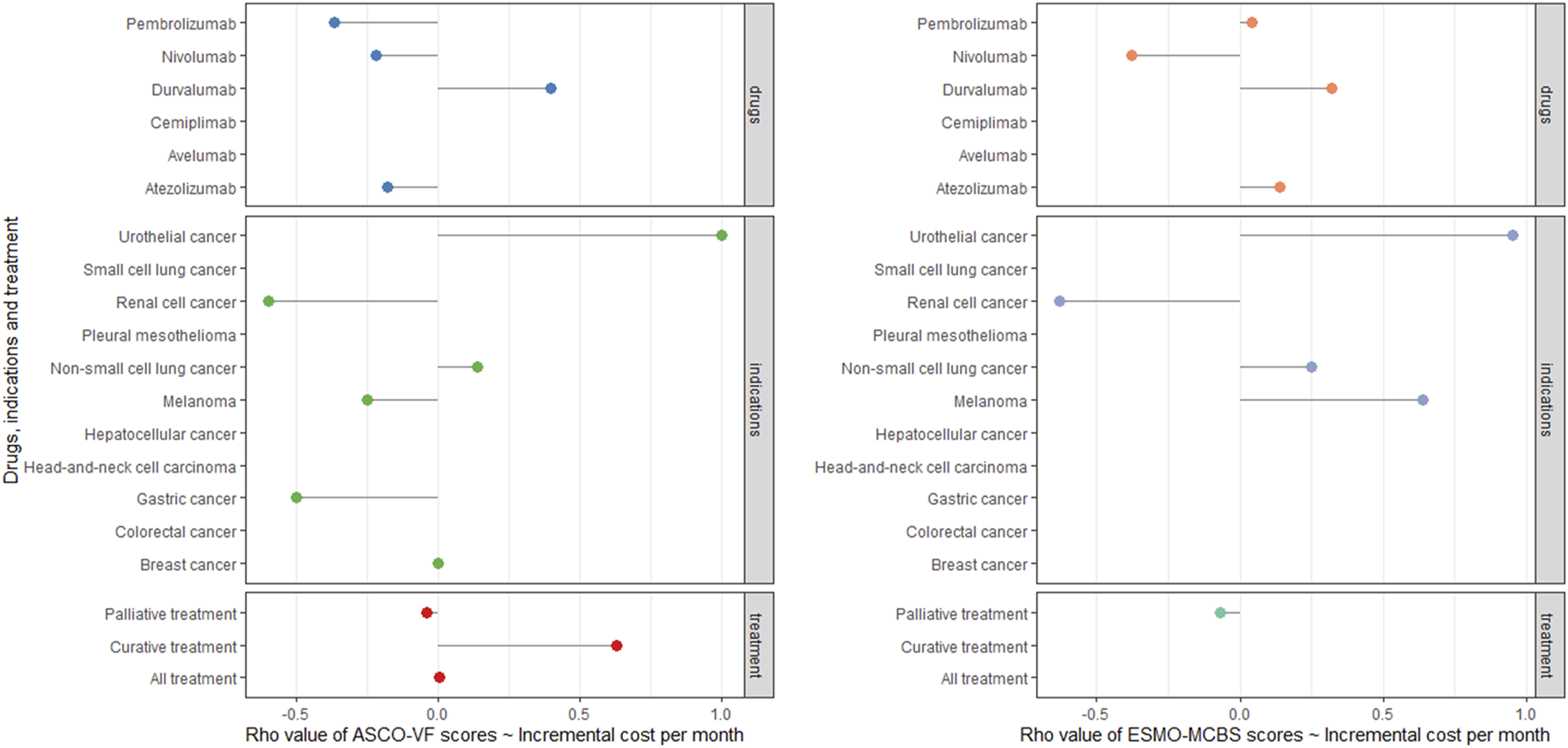 Cleverland of correlation analyses among ASCO-VF scores, ESMO-MCBS scores and incremental cost in six PD-1/PD-L1 inhibitors and 11 indications.