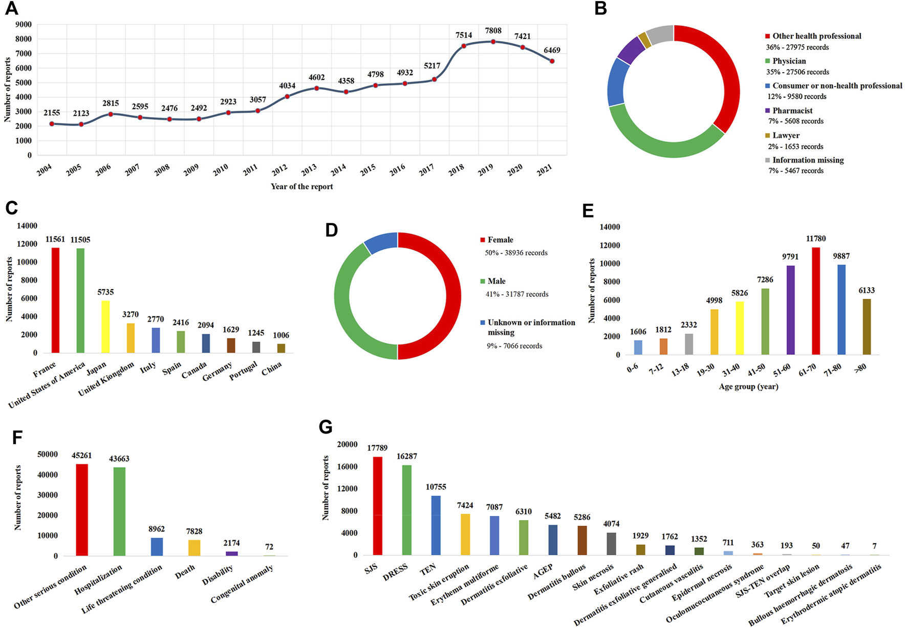 FIGURE 1. Basic information and patient characteristics according to the report. (A) Distribution of the reporting year. (B) Distribution of the reporter. (C) Top 10 countries with the most sources of reports. (D) Distribution of patient gender. (E) Distribution of patient age. (F) Distribution of the patient outcome. (G) Distribution of adverse reactions of preferred terms. AGEP, acute generalized exanthematous pustulosis; DRESS, drug reaction with eosinophilia and systemic symptoms; SJS, Stevens–Johnson syndrome; TEN, toxic epidermal necrolysis.