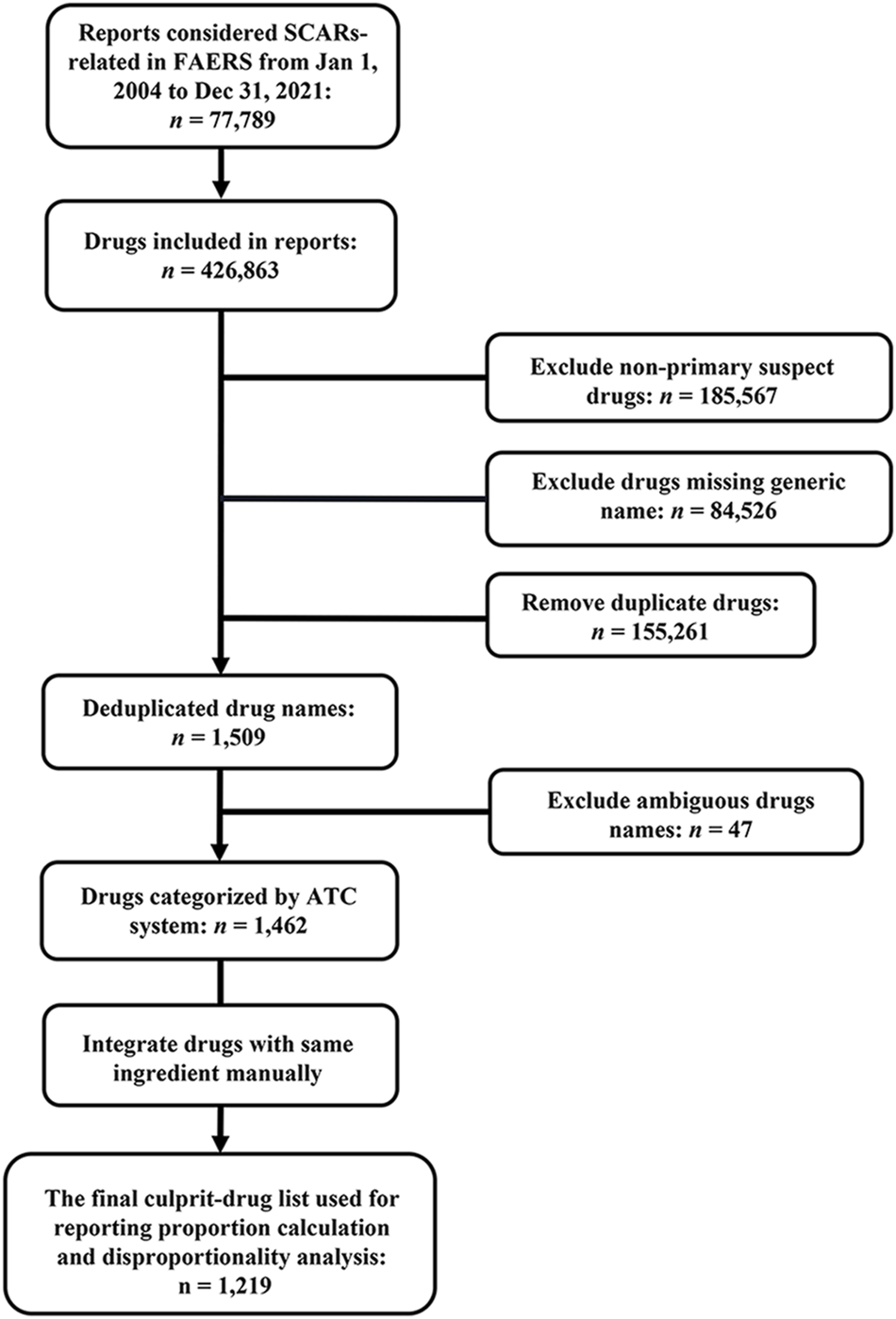 FIGURE 2. Flowchart for data acquisition and processing. ATC, Anatomical Therapeutic Chemical; FAERS, FDA Adverse Event Reporting System; SCARs, severe cutaneous adverse reactions.