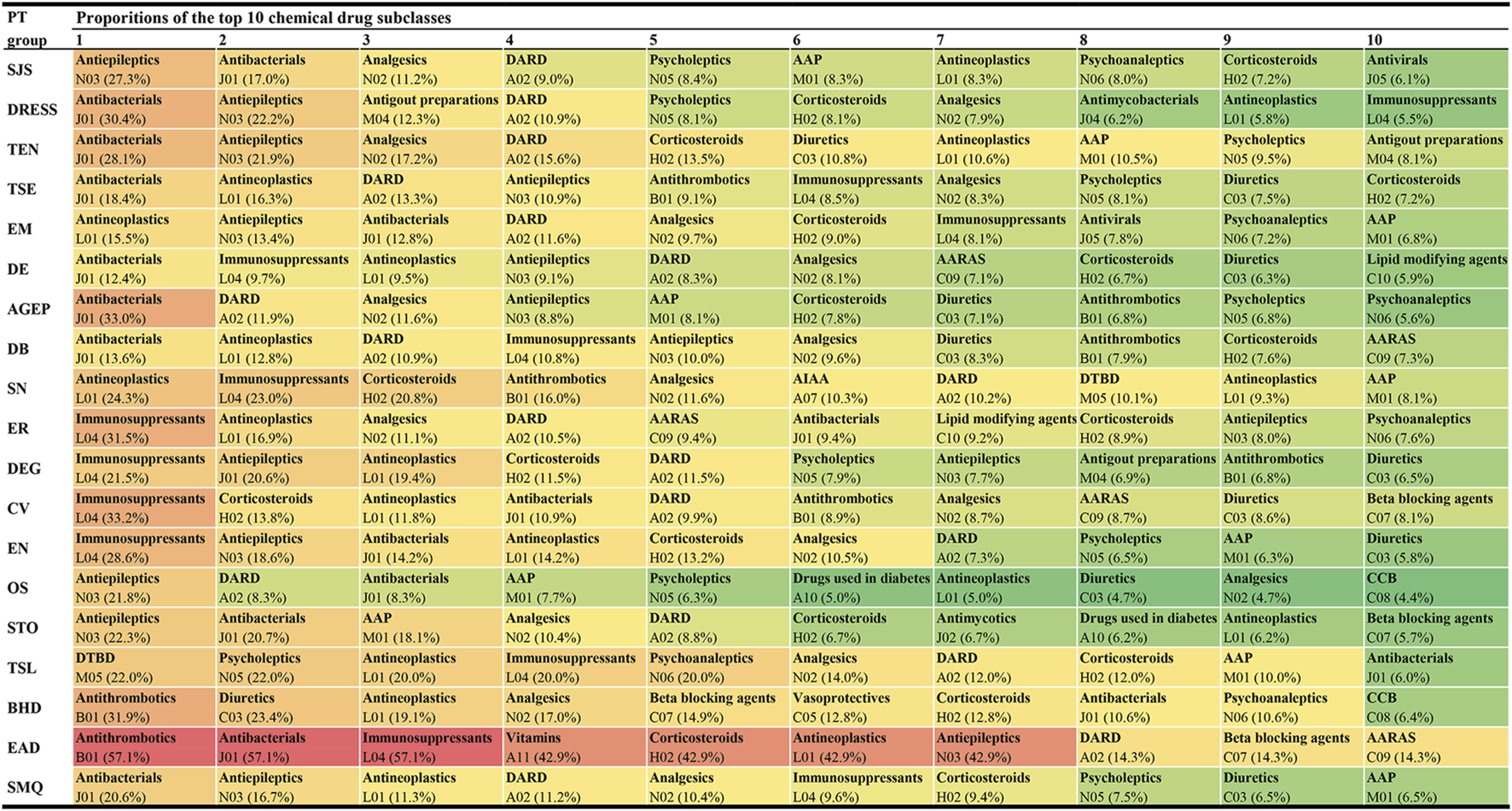FIGURE 4. Top 10 drug classes with the highest reporting proportions at the SMQ and PT levels. AAP, antiinflammatory and antirheumatic products; AARAS, agents acting on the renin-angiotensin system; AIAA, antidiarrheals or intestinal antiinflammatory/antiinfective agents; AGEP, acute generalised exanthematous pustulosis; BHD, bullous haemorrhagic dermatosis; CCB, calcium channel blockers; CV, cutaneous vasculitis; DARD, drugs for acid related disorders; DB, dermatitis bullous; DE, dermatitis exfoliative; DEG, dermatitis exfoliative generalized; DRESS, drug reaction with eosinophilia and systemic symptoms; DTBD, drugs for treatment of bone diseases; EN, epidermal necrosis; EM, erythema multiforme; EAD, erythrodermic atopic dermatitis; ER, exfoliative rash; OS, oculomucocutaneous syndrome; PT, preferred term; SCARs, severe cutaneous adverse reactions; SMQ, Standardized MedDRA Queries; STO, SJS-TEN overlap; SN, skin necrosis; SJS, Stevens-Johnson syndrome; TSL, target skin lesion; TEN, toxic epidermal necrolysis; TSE, toxic skin eruption.