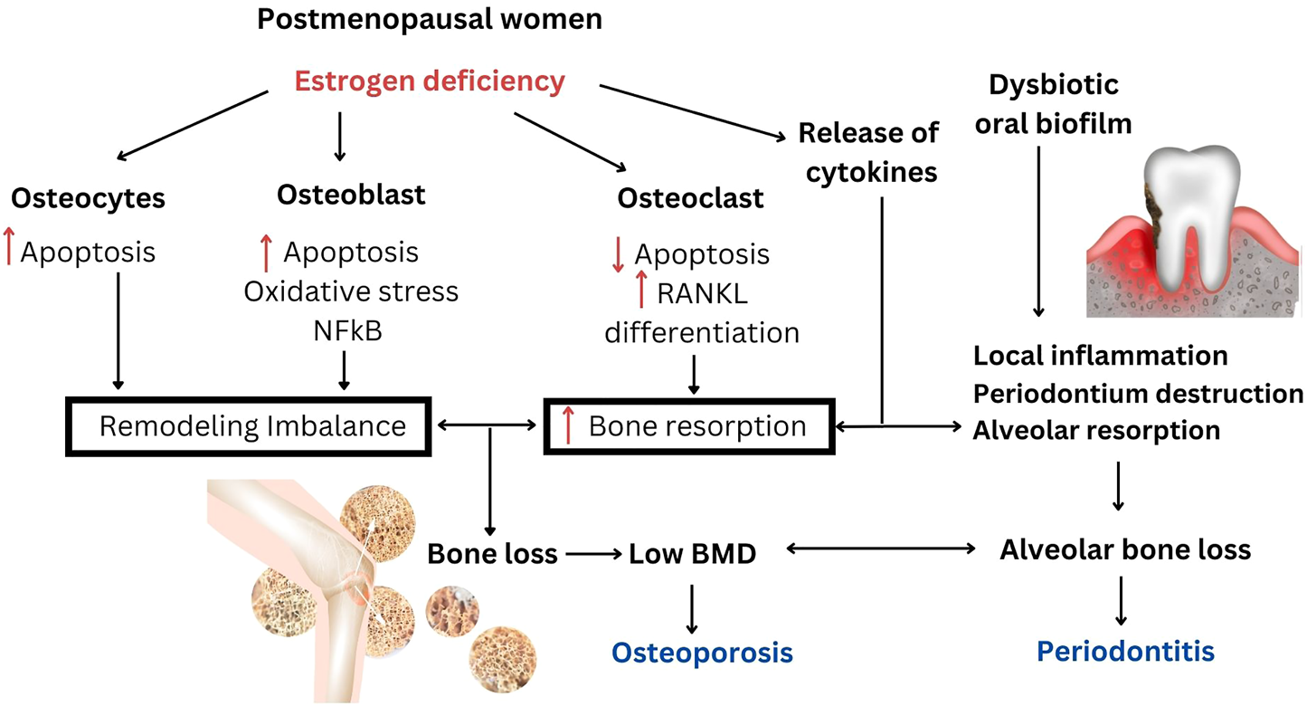 It was hypothesized that osteoporosis could accelerate alveolar bone resorption and bone loss in periodontitis because the loss of alveolar BMD allowed deeper bacterial penetration into the enlarged periodontal space. In response to local inflammation, alveolar resorption could be further amplified and accelerated as focal infection of the periodontium may also release inflammatory cytokines into the system (Barbato et al., 2015). Additionally, overexpression of proinflammatory cytokines with osteoclastic activity occured in both osteoporosis and periodontitis (Barbato et al., 2015; Inchingolo et al., 2020). The impact of estrogen deficiency and the association between postmenopausal osteoporosis and periodontitis are shown in the schematic diagram (Figure 1).