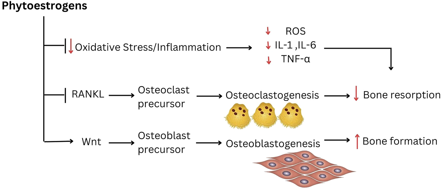 Although human clinical trials are inconsistent and some reported negative findings, numerous in vitro and animal studies on phytoestrogens revealed encouraging bone sparing effects. Phytoestrogen could promote osteogenesis by specifically targeting osteoblast and osteoclast. The administration of phytoestrogens such as isoflavones and flavonoids promoted bone formation, which stimulate the expression of osteogenic markers such as Runx2, ALP, osteocalcin, type 1 collagen (COL-1), osteopontin, and morphogenetic protein-2 (BMP-2) for osteoblast differentiation and bone matrix mineralization (Ramesh et al., 2021; Ortiz et al., 2022; Sekaran et al., 2022). Additionally, by virtue of its similar structure to 17β-estradiol in conformational binding to estrogen receptors, phytoestrogen has capability to reciprocally affect osteogenic versus adipogenic differentiation of mesenchymal stem cells (MSCs) in a dose dependent manner. For instance, phytoestrogen stimulated osteoblast differentiation from MSCs via the activation of important signalling pathways such as Smad, Wnt/β-catenin and Sirt1 pathways (Schilling et al., 2014; Gorabi et al., 2019; Khezri et al., 2021; Wang et al., 2021). Concomitantly, there is evidence that phytoestrogen suppressed the adipogenic differentiation signalling pathway including PPAR and C/EBP pathways in a dose dependent manner (Schilling et al., 2014; Ahmed 2014).