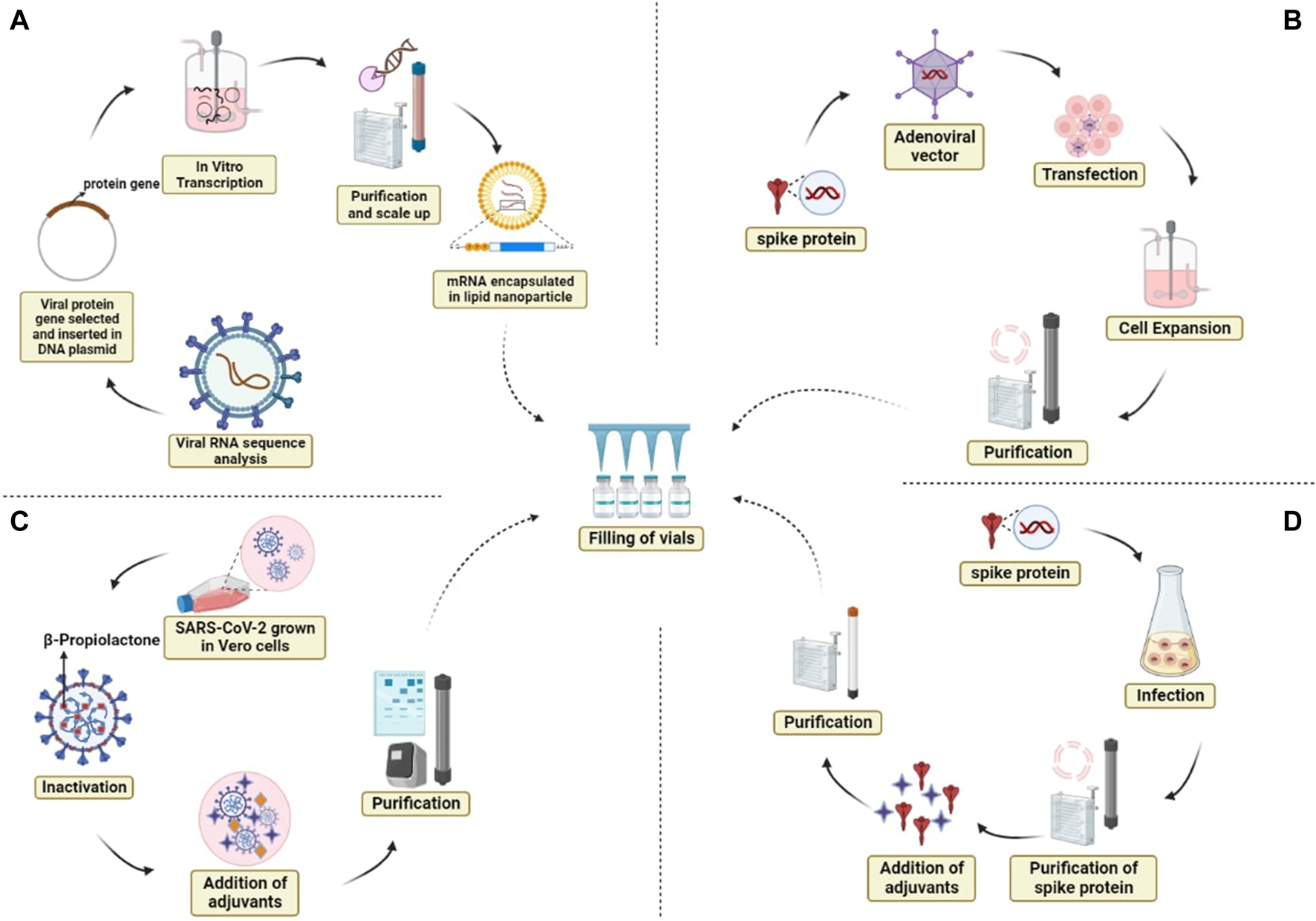 Different platforms for vaccine production and their modes of action. (A) mRNA vaccine, (B) adenoviral vector vaccine, (C) whole inactivated virus, and (D) protein subunit vaccine.
