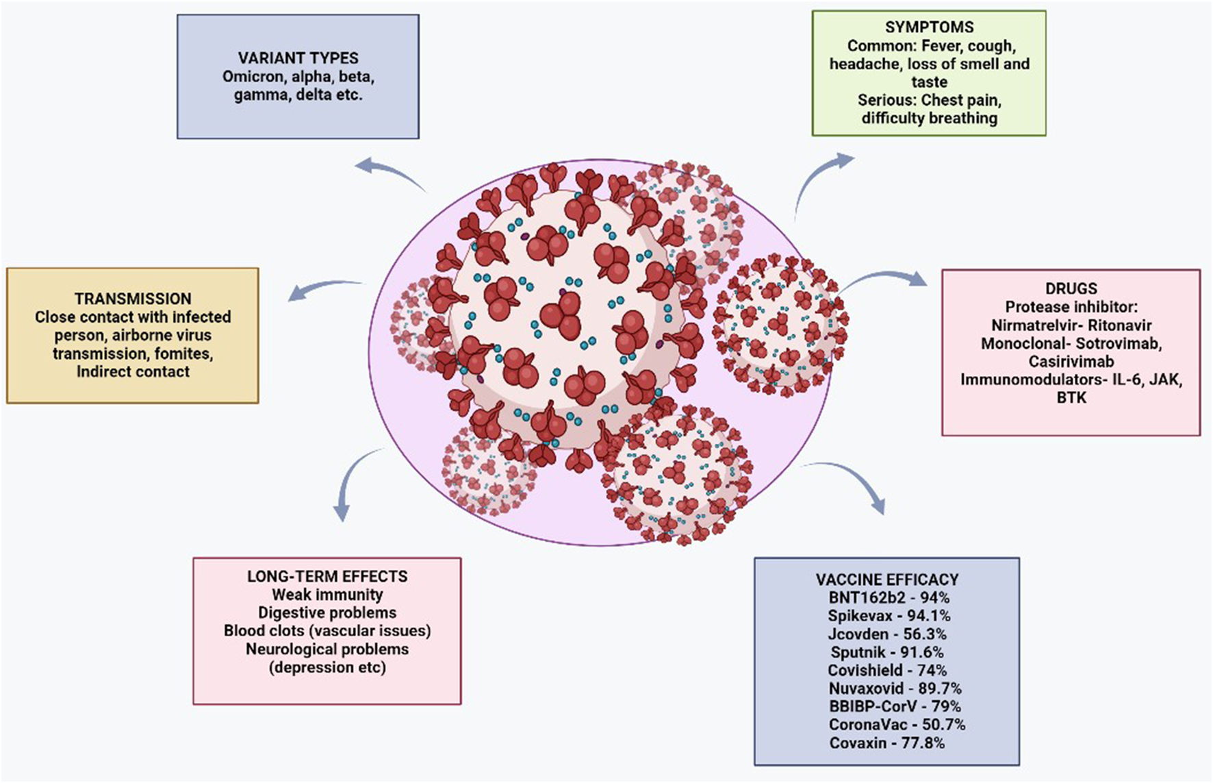 The SARS-CoV-2 virus, which was first discovered in China, has already spread to every country in the world. The genome of SARS-CoV-2 contains a positive-sensed RNA virus enclosed by an envelope. The genomic sequence of SARS-CoV-2 was first made public in January 2020, and comparisons with other coronaviruses show that it differs from these in terms of its strong affinity for the ACE2 receptor and the presence of a polybasic cleavage site at the S1/S2 spike junction that controls infectivity and host range. After its discovery, various mutations occurred in the virus genome, which resulted in the development of various mutant strains, such as the alpha, beta, and delta variants. The receptor-binding domain (RBD) of the spike (S) protein mediates viral entry by binding with the human cell surface protein angiotensin-converting enzyme 2 (ACE2). Figure 1 shows the structure of SARS-CoV-2. According to sequencing results, the SARS-CoV-2 genome undergoes two single-nucleotide alterations per month. In the alpha variant, 17 mutations can be seen in the genome, which includes mutations of the receptor-binding domain, such as E484K, S494 P, and N501Y, and mutations in the s-glycoprotein comprising 69del, 70del, D614G, 144del, and A570D. These mutations in the receptor-binding domain and s-glycoprotein region make the virus 70% more transmissible. Deletions in the spike protein correlate with the immune response of the infected person. In addition, increased virulence and infectivity have been linked to the N501Y mutation in mouse models (Brief, 2020; Hill et al., 2022). RBD mutations in the beta [K417N/E484K/N501Y] (Planas et al., 2021; Zhou et al., 2021), gamma [K417T/E484K/N501Y] (Burki, 2021; Lancet, 2021; Xie et al., 2021), delta [T478K, and L452R] (Goher et al., 2022), and omicron variants [L452R/F486V/F486V/L452R/L452R, F486V/R493Q] (Mohapatra et al., 2022) have also been explored by scientists. Mutations in the beta variant have been shown to have a stronger affinity (4.62 times higher) for binding hACE2 (Ramanathan et al., 2021). RBD mutations in the epsilon, beta, and theta variants resulted in an increase in infectivity in vitro and also made the virus 20% more transmissible (Ali et al., 2021a; Deng et al., 2021; McCallum et al., 2021; Zhao et al., 2021). In January 2022, a virologist discovered a new variant of SARS-CoV-2 in Cyprus and named it “deltacron.” Deltacron is a super-variant with the combined genome of the delta and omicron variants (Kreier, 2022). Genome analysis of deltacron showed that the RBD is derived from the omicron variant, and this variant may lead to enhanced disease transmission and immune evasion (Colson et al., 2022; Hosch et al., 2022).