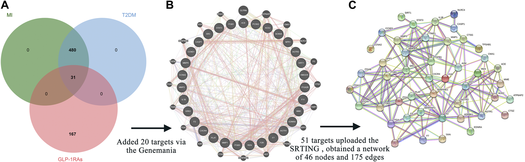 Intersection targets and associated targets constructed the protein-protein interaction (PPI) network. (A) The 31 intersection targets overlap between the targets of GLP-1RAs and the targets of T2DM with MI. (B) Twenty targets associated with 31 intersection targets were generated via the GeneMANIA database. (C) The 51 related targets constructed a PPI network containing 46 nodes and 175 edges. The interaction score was set at 0.7 (high confidence) and hid disconnected nodes in the network.