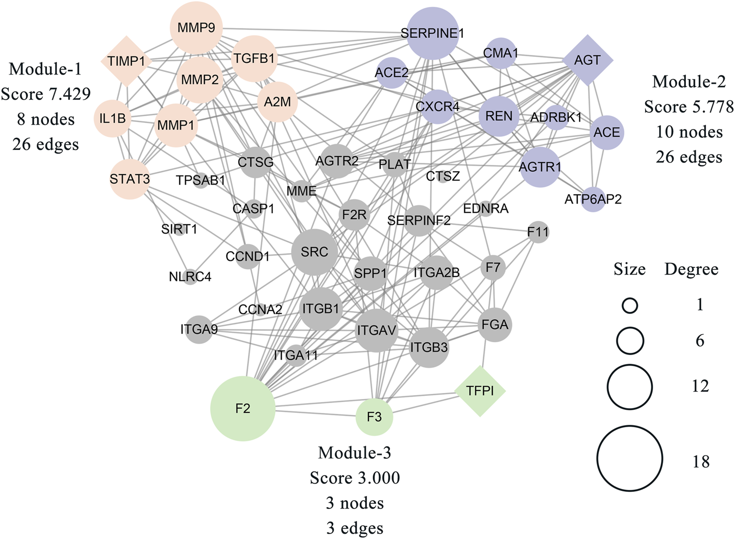 Three modules were clustered from 46 related targets of the PPI network and distinguished by different colors. The module-1 has top clustered strength according to the score. The size of each node is proportionate to the degree value of the node. The diamond-shaped nodes in each module represent the seed node with the highest weight.