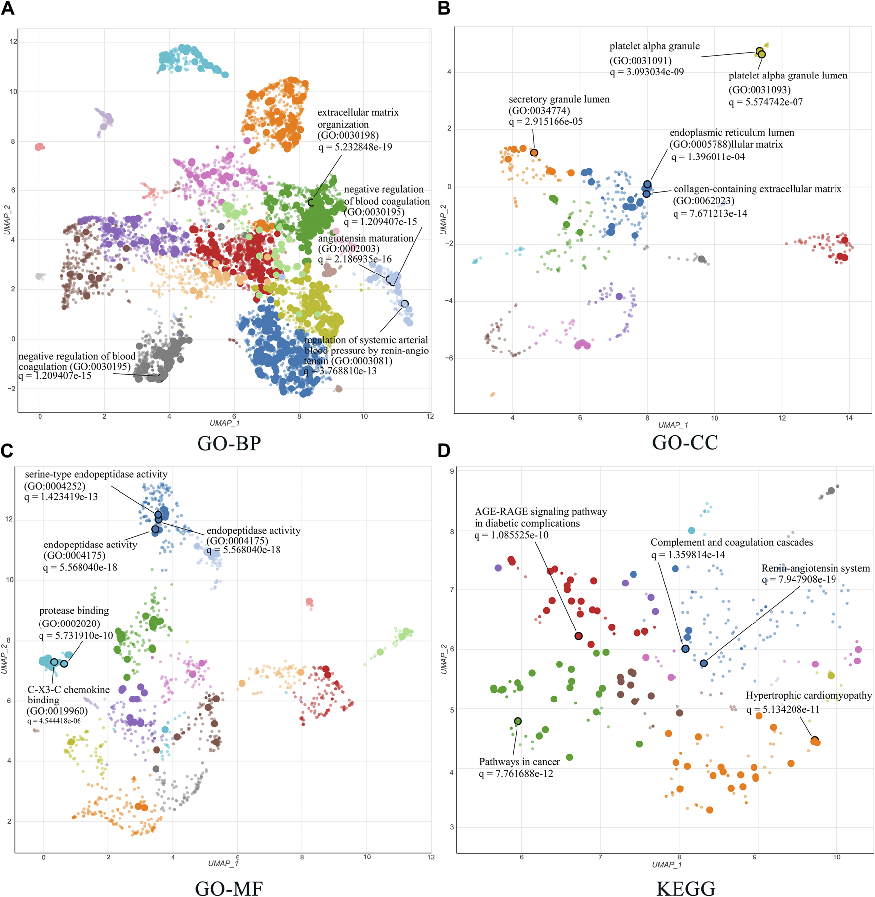 To further uncover the underlying biological process and involved signaling pathways in related targets, the KEGG pathway and GO enrichment analysis, including biological process (BP), cellular component (CC), and molecular function (MF), were conducted using Enrichr web tools (Kuleshov et al., 2016), and these enrichment results were presented in a scatter plot using the Appyters web application (Clarke et al., 2021). Similar gene sets were clustered in a scatter plot using the Leiden algorithm. According to the q value (adjusted p-value), the top five GO and KEGG analysis terms were listed and marked in the scatter plots.