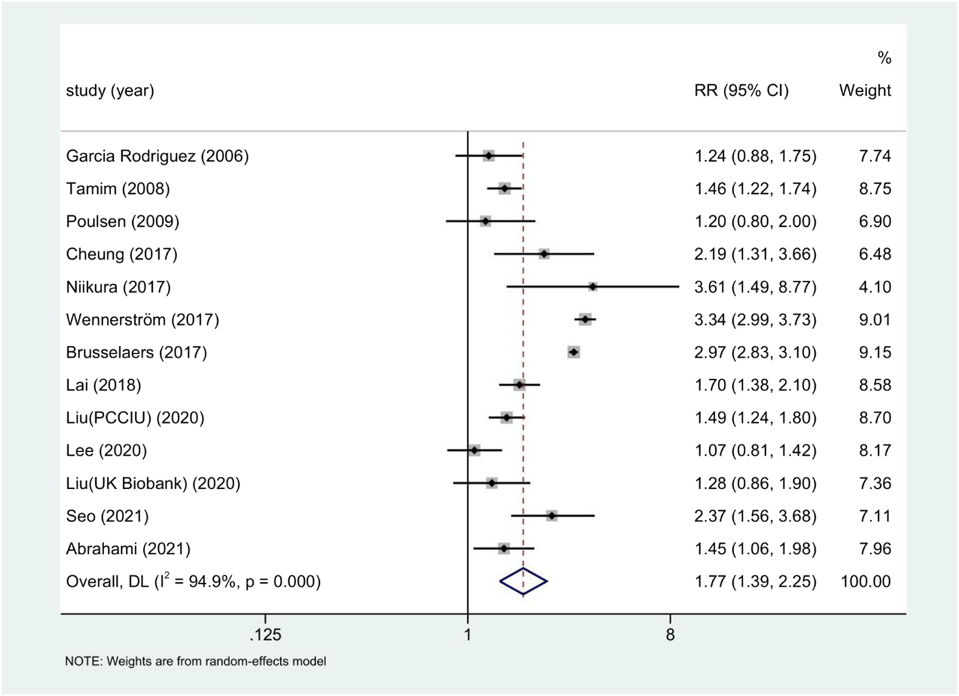 The relationship between long-term PPI use and colorectal cancer risk is shown in Figure 6 in the Supplement appendix 3. The results of 11 studies conducted on 3,634,486 participants showed that long-term use of PPI had no significant correlation with the increased risk of colorectal cancer. The overall adjusted RR was 1.22 (95% CI: 0.95–1.55), which was highly heterogeneous (p < 0.05; I2 = 96.7%).