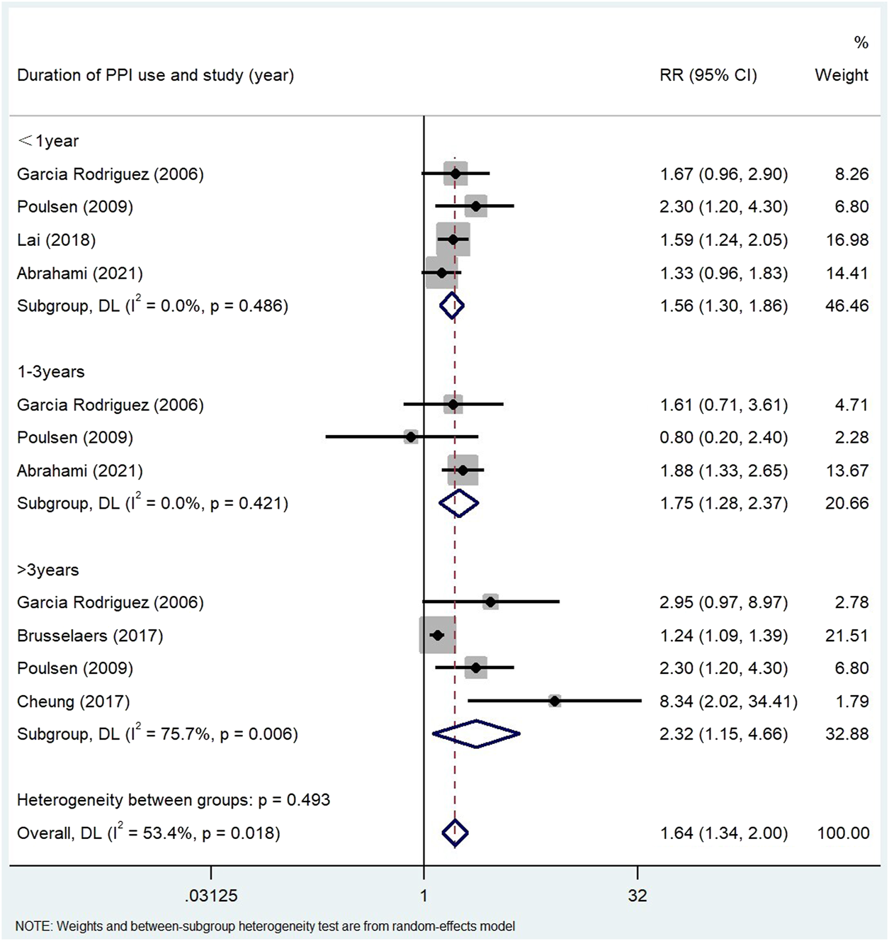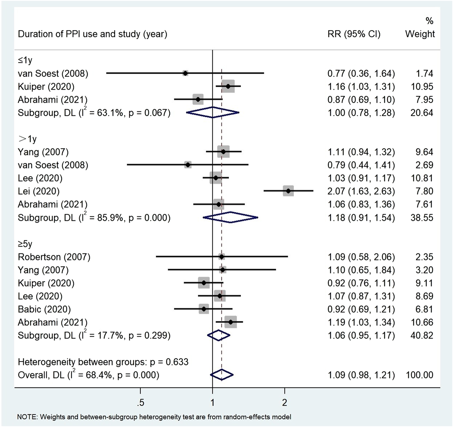 FIGURE 7. Association between the use of PPI and risks of Colorectal Cancer stratified by duration of PPI.