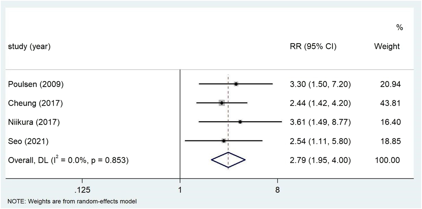 Data extraction was performed independently by two investigators, results were compared, and discussions were conducted to resolve disagreements. The following information was extracted: first author name, year of publication, region, study design, observation period, percentage of sex, size and mean age of the included population, lag time, primary and secondary outcomes. Two investigators independently assessed the methodological quality of included studies using the Newcastle-Ottawa Scale. Three areas of research were evaluated, including selection of participants, comparability of study groups, and identification of outcomes of interest, to assign star ratings representing the quality of the study (Oremus et al., 2012). The overall quality score is nine points. We consider a study to be of high quality if it has a score of ≥7 (Supplementary Table S1).