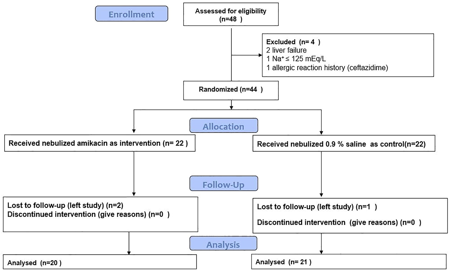 University Ethics Committee approved the trial (with code IR. SBMU.PHARMACY.REC.1400.039), and informed consent was obtained from patients or their legal guardians. The trial was registered at Iranian registry of clinical trials by the code IRCT20120415009475N10. The sample size was estimated with a confidence level of 95 percent and power of 80 percent with data from previous studies of 40 Patients divided into two main groups of 20; Patients in Neb− Group received intravenous Ceftazidime, intravenous Amikacin and inhaled NaCl 0.9%. Patients in the Neb + group received intravenous Ceftazidime, intravenous Amikacin, and inhaled Amikacin.