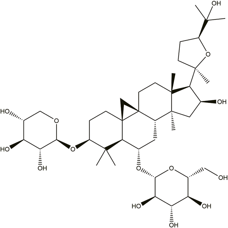 Astragaloside IV (AS-IV) is a primary active component found in AR and is utilized as a quality control marker of Huangqi as per the Chinese Pharmacopeia (2015 version). AS-IV can be obtained and separated using various methods, including ultrafiltration, high-speed centrifugation, reflux, water extraction, ultrasonic extraction, and ethanol precipitation (Ren et al., 2013). AS-IV is a cyclopropane triterpene saponin with a molecular formula of C14H68O14 and a relative molecular mass of 784.97 (Figure 2). It exhibits a diverse range of pharmacological activities, including antioxidant, cardioprotective, anti-inflammatory, antiviral, antibacterial, antifibrotic, anti-diabetic, and immunoregulatory effects. These properties make it a promising therapeutic candidate for treating cerebral injury and central nervous system, cardiovascular disease, respiratory system, kidney, endocrine system, organic immune system, liver, and cancer (Ren et al., 2013; Li et al., 2017).