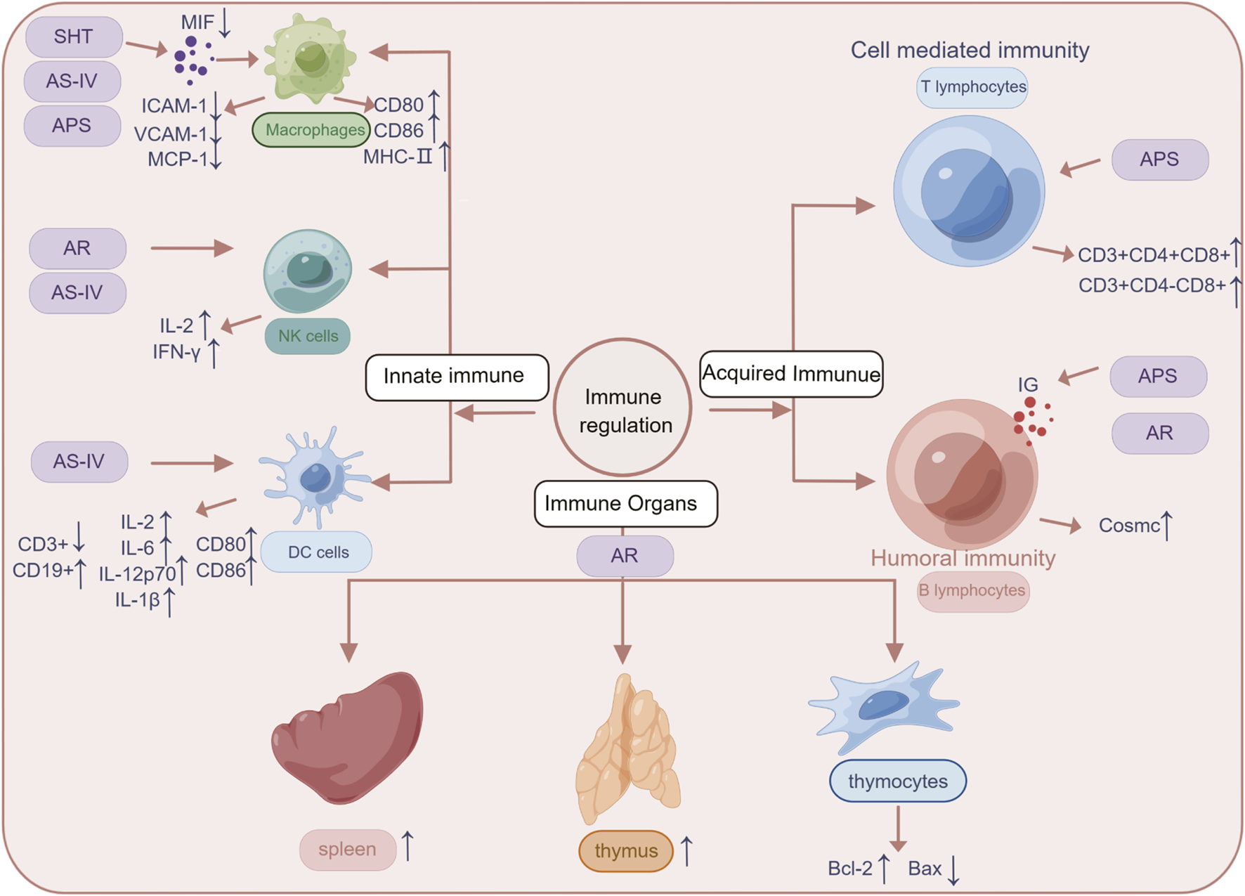 Immune organs are specialized tissues and structures where immune cells are produced, differentiated, and integrated. These vital structures facilitate immune function and actively participate in immune responses. Immune organs can be broadly classified into central immune organs, which include the thymus, bone marrow, and bursa of Fabricius, and peripheral immune organs, which include the spleen, lymph nodes, and mucosa-associated lymphoid tissue. Research has shown that AR aqueous decoction had a significant impact on increasing the spleen and thymus indices in rats with spleen deficiency (Zhang et al., 2021). Subsequent experiments demonstrated that AR injections (2.5, 5, 10 mL/kg for 6 days) effectively reduced thymocyte apoptosis in rats with severe pneumonia. This may be attributed to the promotion of B lymphocytoma-2 (Bcl-2) expression, the decrease of Bax expression, and the increase of the bcl-2/Bax ratio (Lei et al., 2011).
