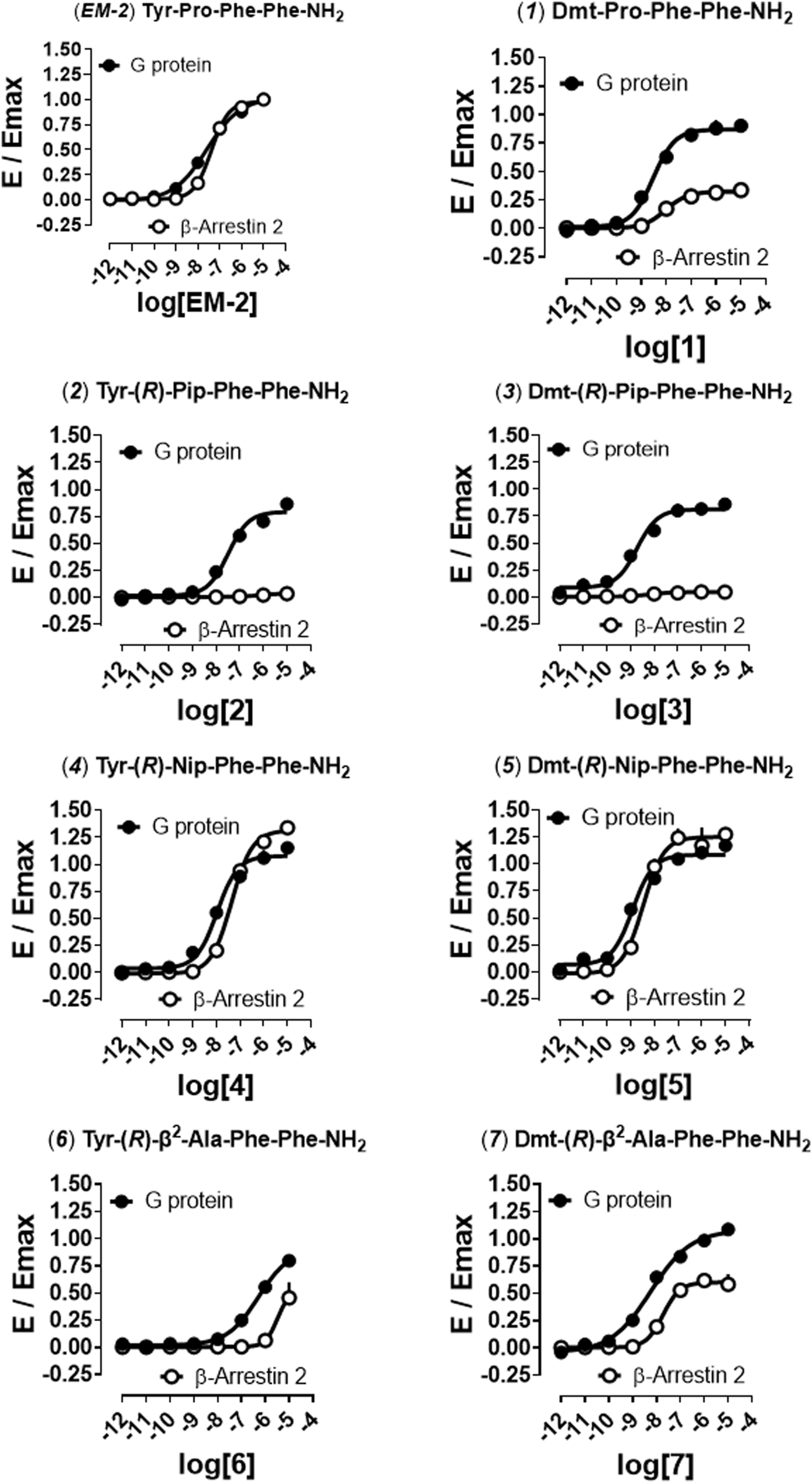 Opioid peptides might be an alternative to morphine-based drugs, as they have high potency, exquisite selectivity and low toxicity (Czapla et al., 2000; Wilson et al., 2000). In the search for biased ligands of peptide structure, we turned our attention to endogenous mu opioid receptor ligands, endomorphins (EM-1, Tyr-Pro-Trp-Phe-NH2, and EM-2, Tyr-Pro-Phe-Phe-NH2) (Zadina et al., 1997). Similarly to morphine, EMs activate both G protein and β-arrestin pathways (Lamberts and Traynor. 2013). In this study we synthesized a series EM-2 analogs with modifications in positions 1, 2, and 3, designed to enhance their enzymatic stability, bioavailability and functional selectivity as compared with the parent compound.