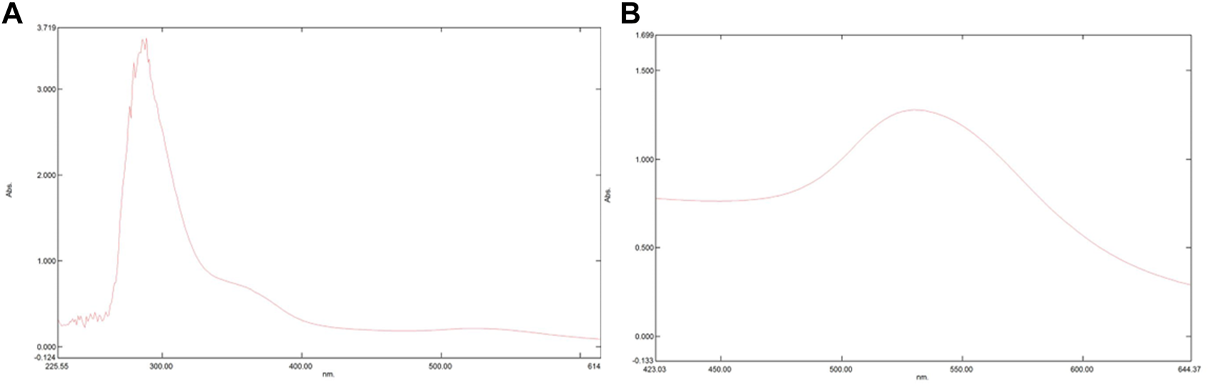 Pictorial representation of peaks formed in UV-Vis Spectrophotometer. UV-Vis Spectrophotometer is used to assess the maximum absorption of a particular compounds thereby predicting surface plasmon resonance. The shift in peak demonstrates that there is a change in the chemical composition of a particular compound. As shown in the above figure, there is shift from 280 nm to 300 nm in (A) which represents the spectrophotometric analysis of AuNP-PHF, while in (B) which depicts the spectrophotometric analysis of AuNP-Dox with a peak shift from 280 nm to 530 nm. Since AuNPs were commercially purchased with maximum absorption at 280 nm analysis for AuNPs was not performed.